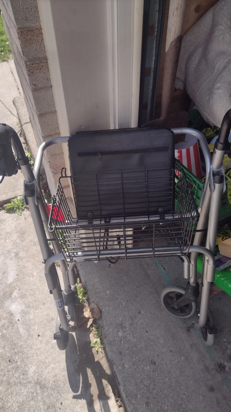 This walker features a built-in seat and a storage basket for convenience. It's designed for mobility assistance. The frame is silver-coloured metal. This walker is great for anyone needing support while moving around.