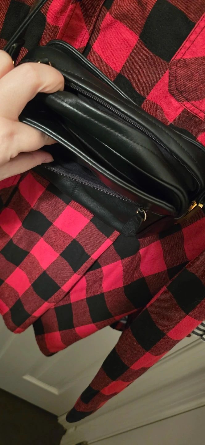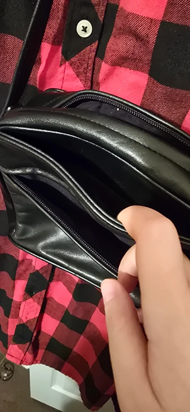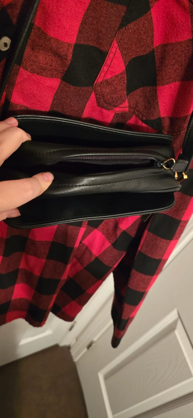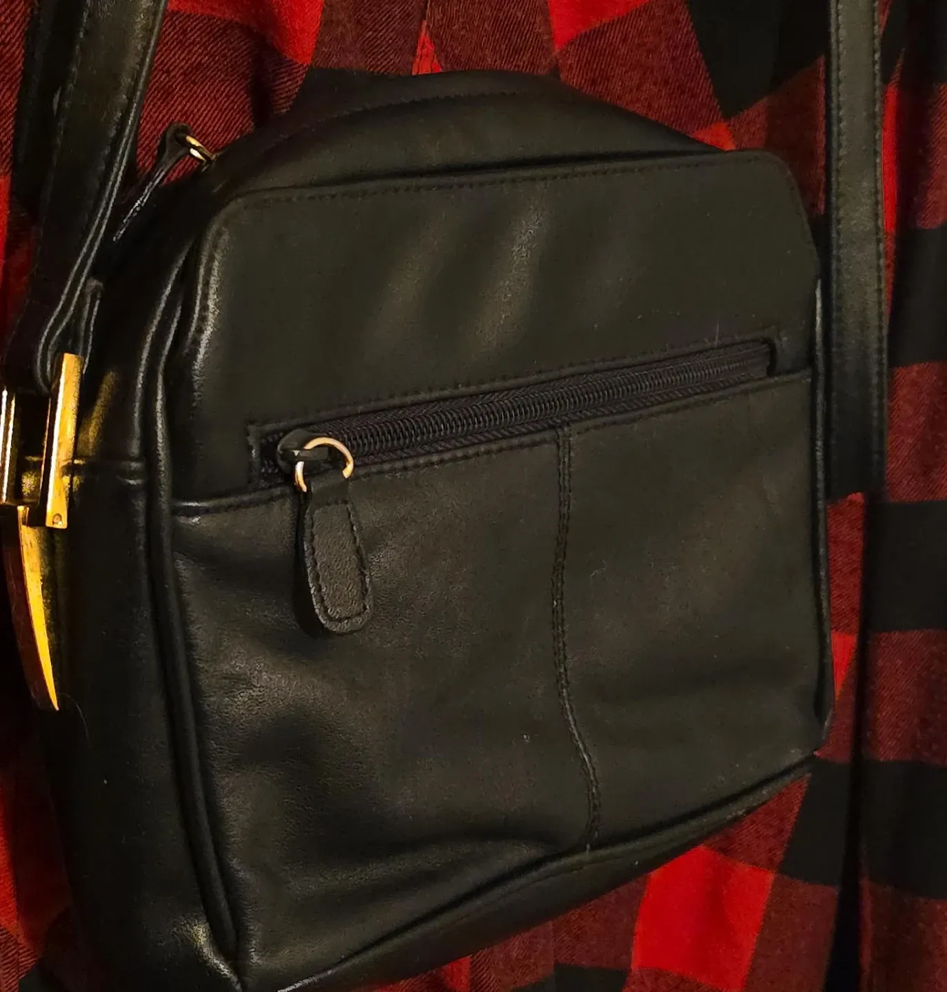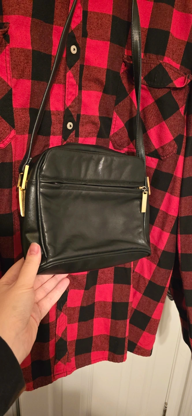 A classic black leather crossbody bag with gold accents. It features a zippered main compartment and an exterior zippered pocket on both sides plus non zippered pockets behind them and for the main compartment there's a zippered small long pocket inside on the wall of it