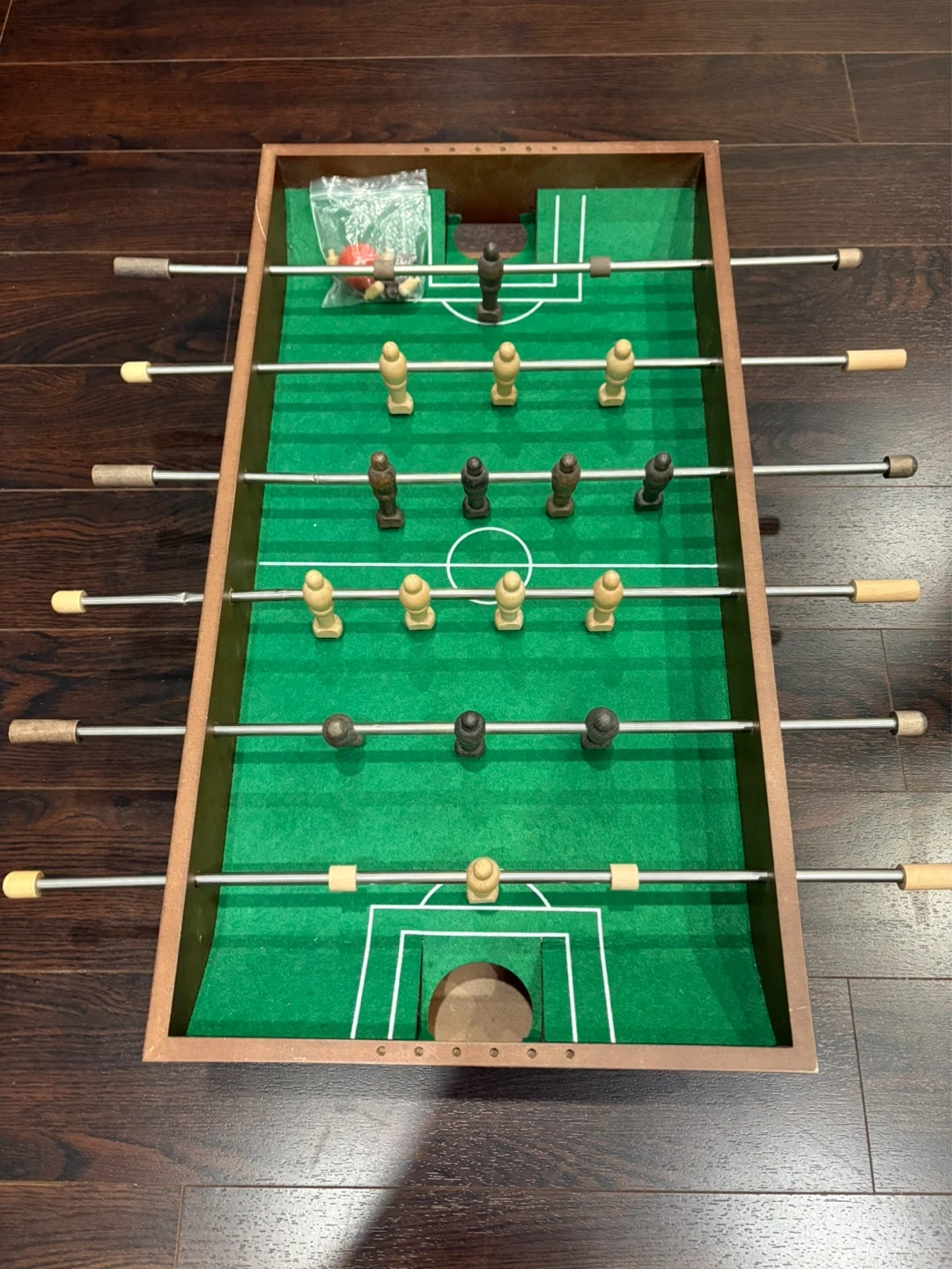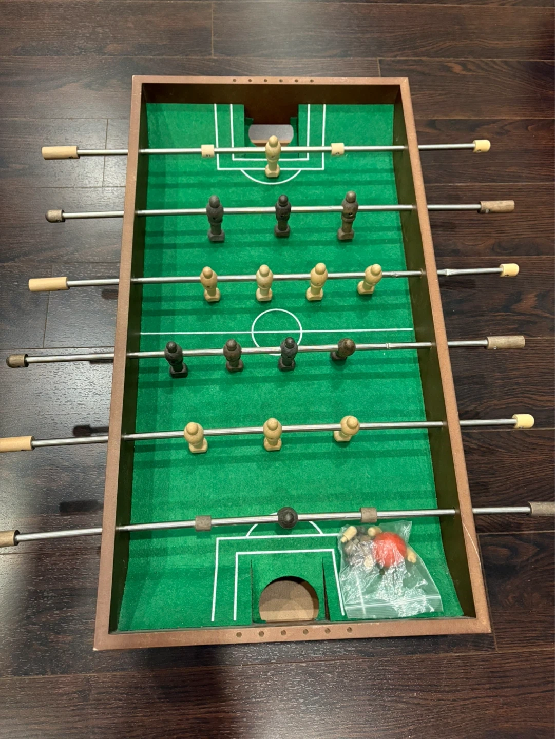 Compact tabletop foosball game with a wooden frame. Includes a set of playing pieces and soccer balls. It's about 2 feet long. Fun for game nights!