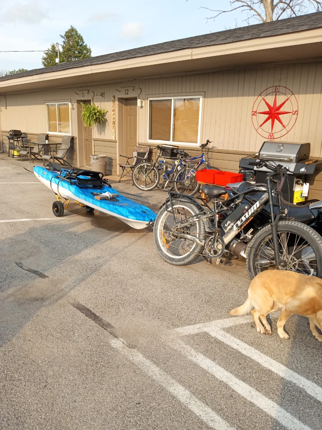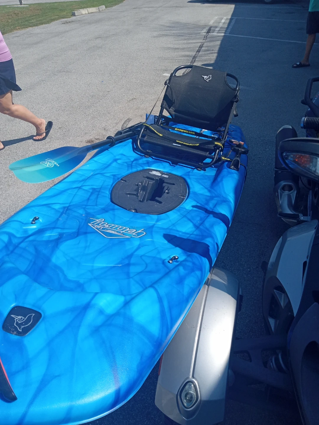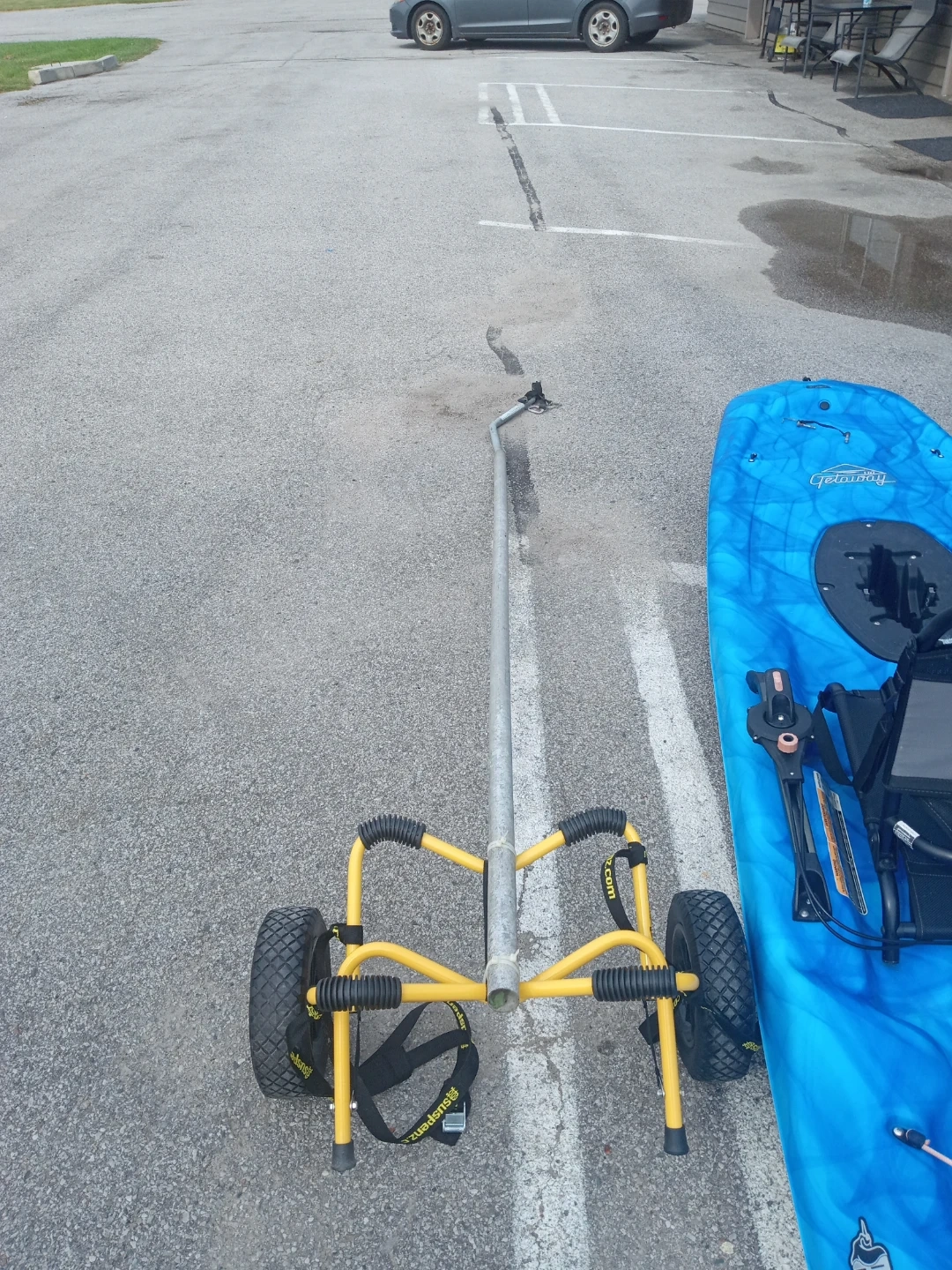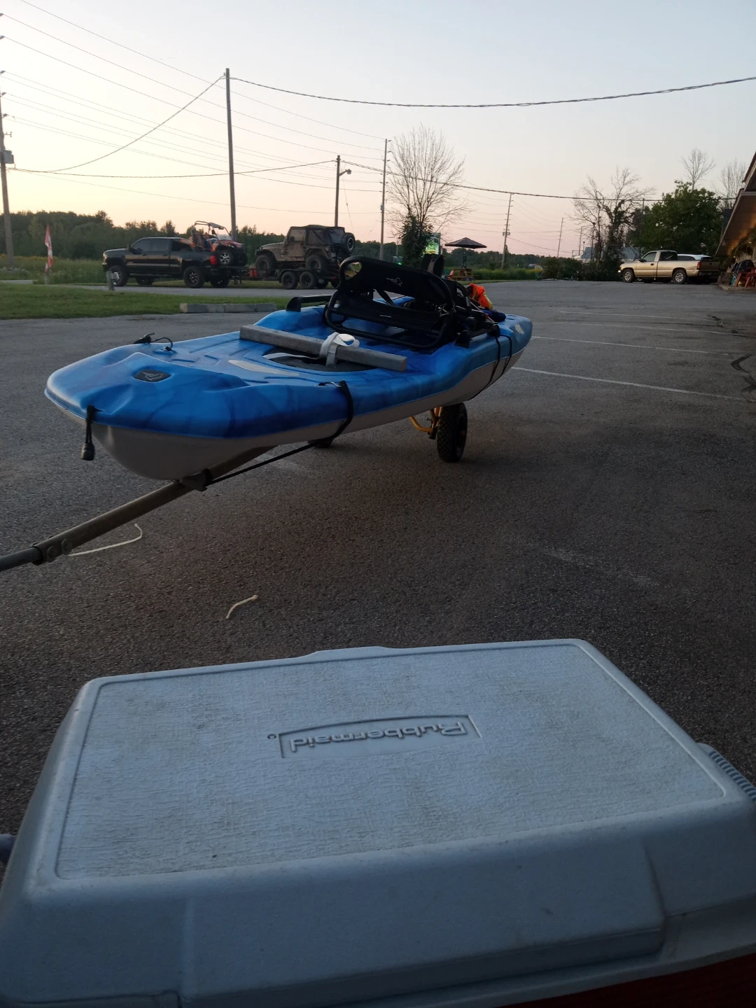 This is a blue and white Lifetime Tamarack Angler 100 kayak. It comes with a peddles and a yellow kayak cart for easy transport. It's designed for fishing adventures!