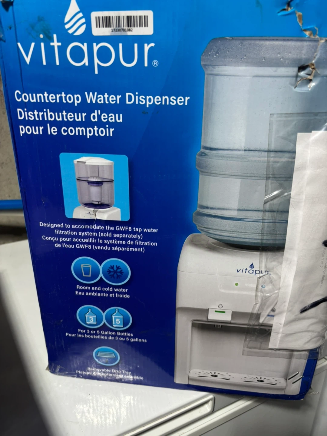 This Vitapur countertop water dispenser provides both room and cold water. It's designed to accommodate 3 or 5-gallon bottles. Features a removable drip tray.