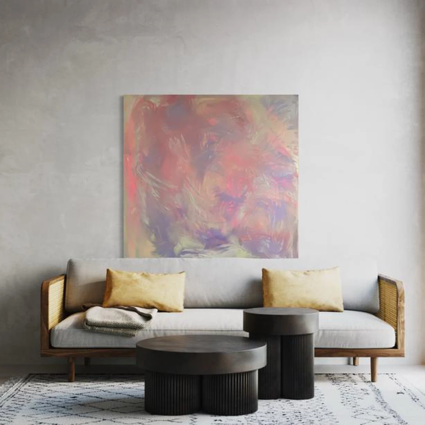 This is an abstract painting featuring soft pastel colours with brushstrokes of pink, purple, and yellow. It's a beautiful piece that adds a touch of modern art to any room. The painting is unframed.