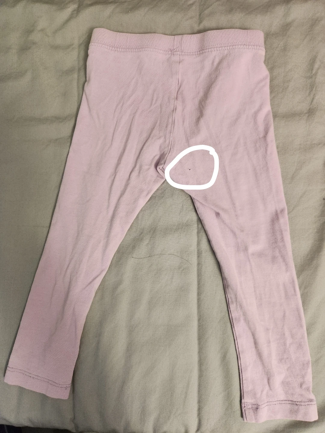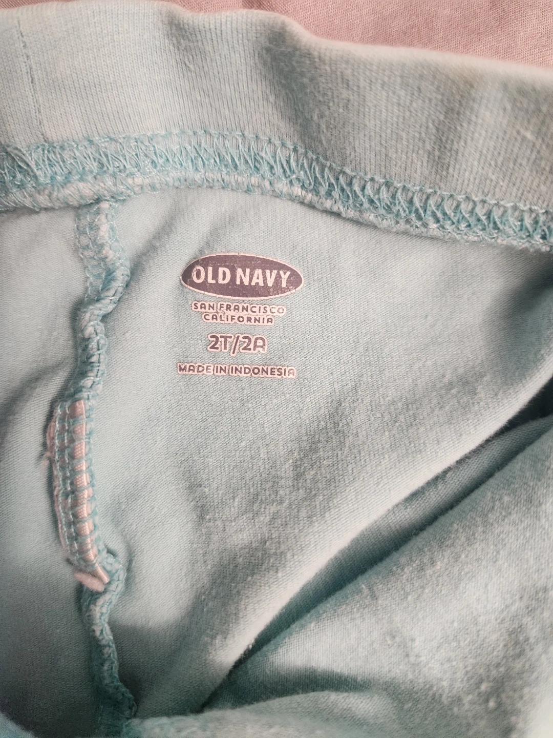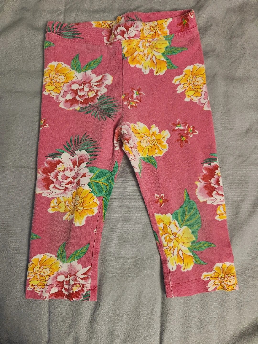 Bundle of five pairs of kids' leggings in size 3T and 2T. Includes one floral print pair from Old Navy and four solid coloured pairs.
