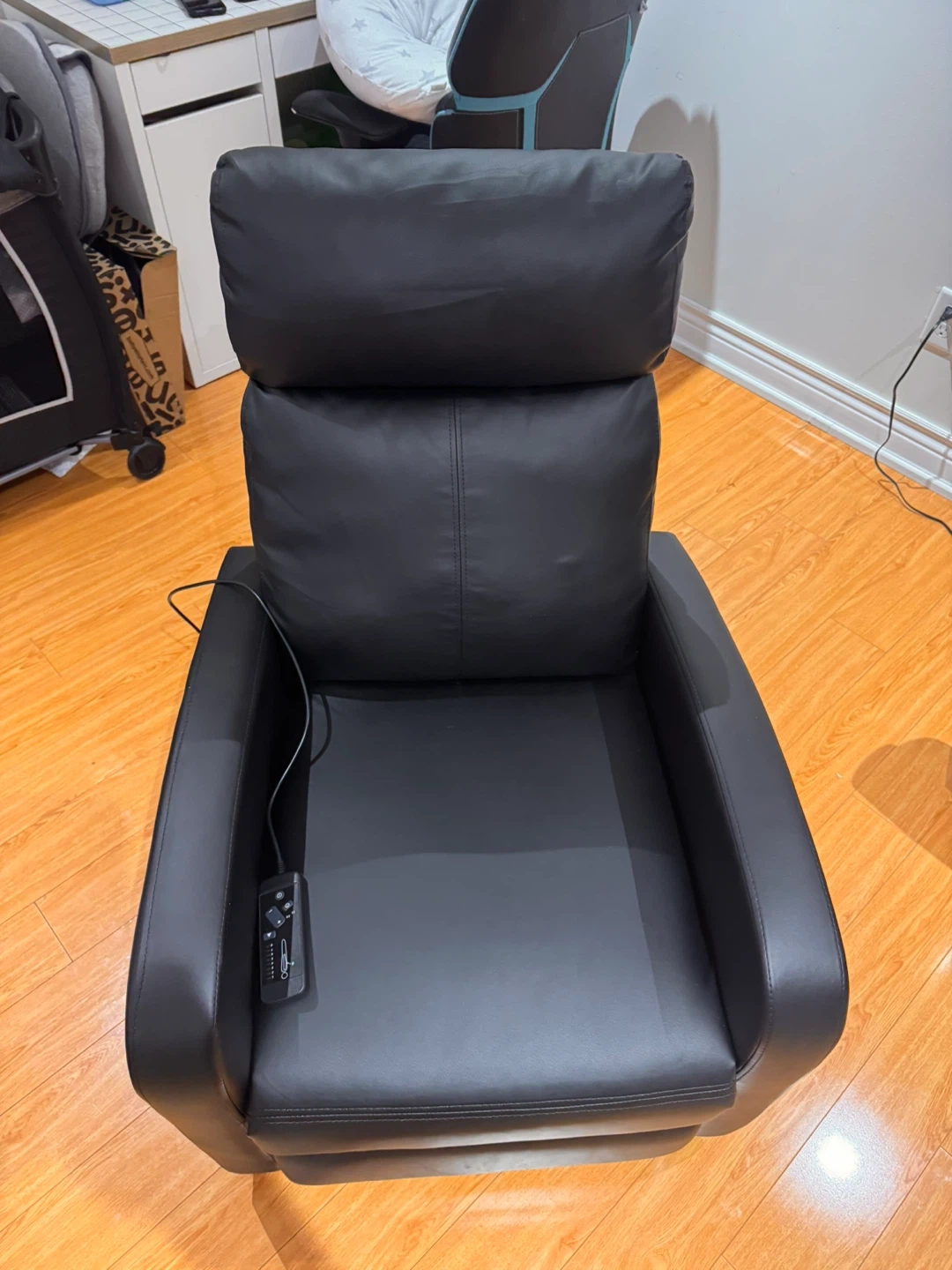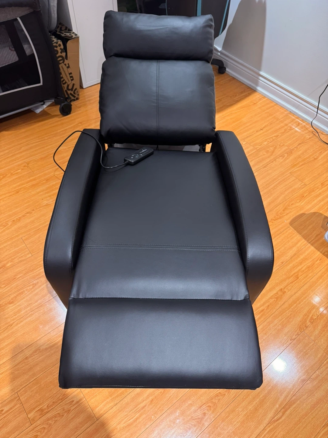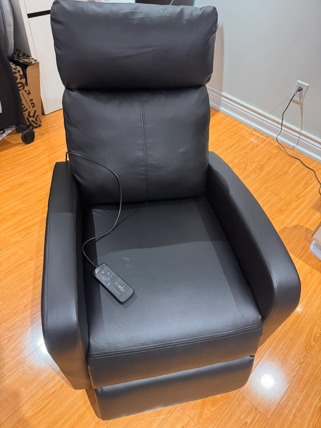 This is a comfortable black faux leather recliner chair. It has a remote control for adjustments. The chair reclines fully and has a footrest. It's a great addition to any living room!
