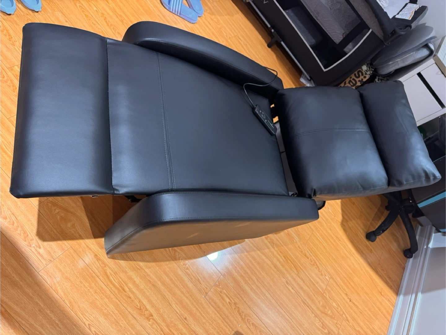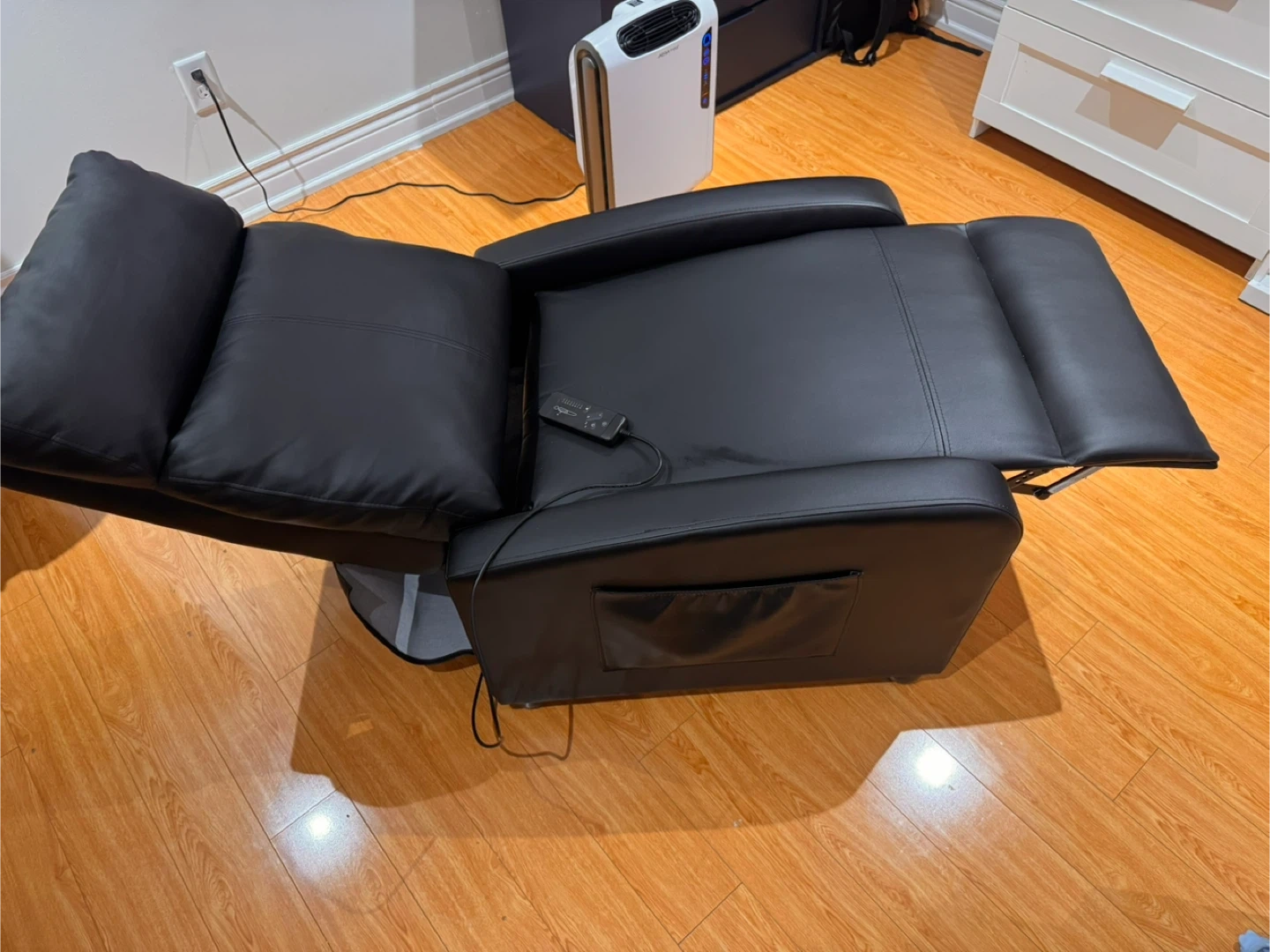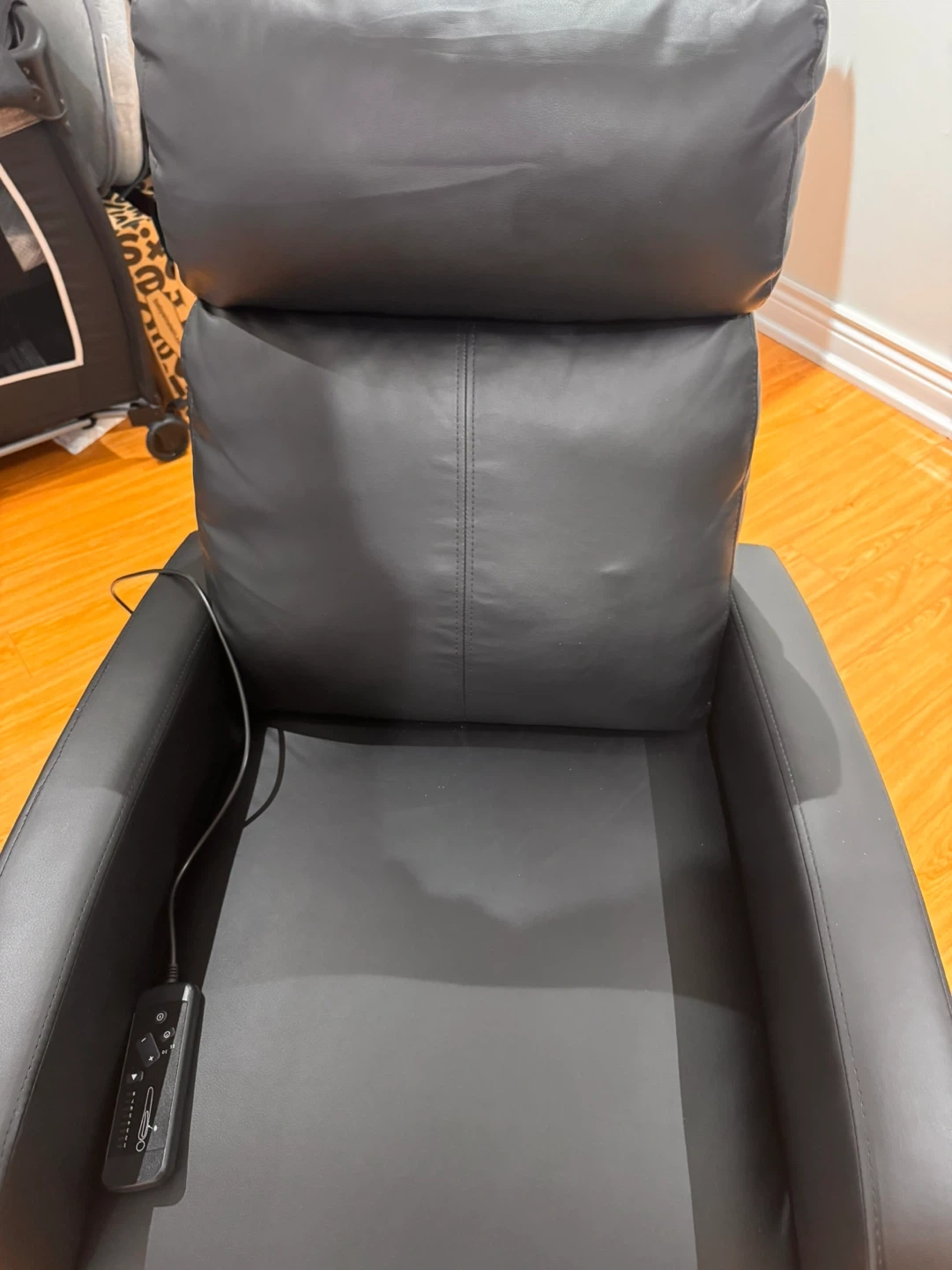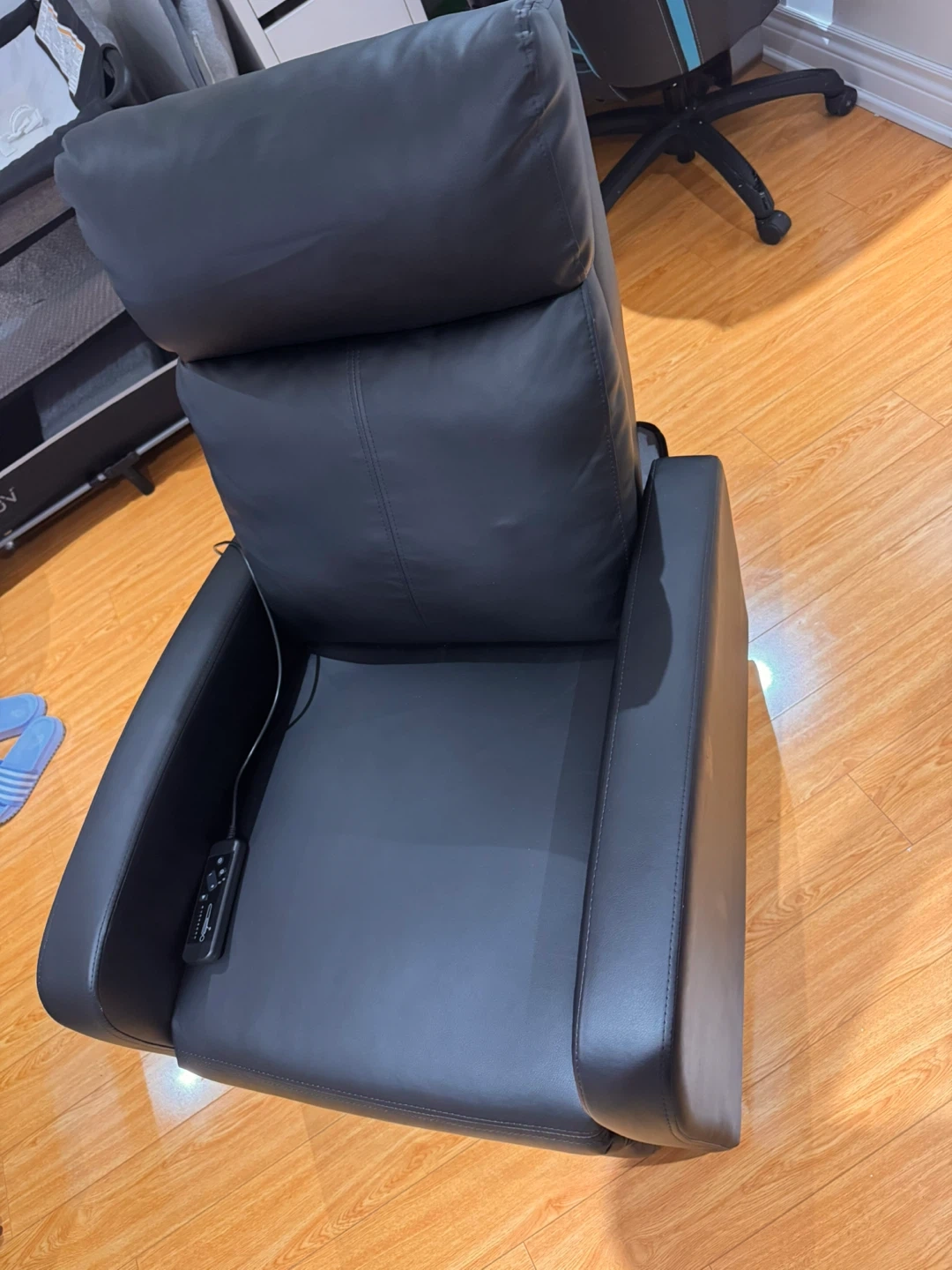 This is a comfortable black faux leather recliner chair. It has a remote control for adjustments. The chair reclines fully and has a footrest. It's a great addition to any living room!