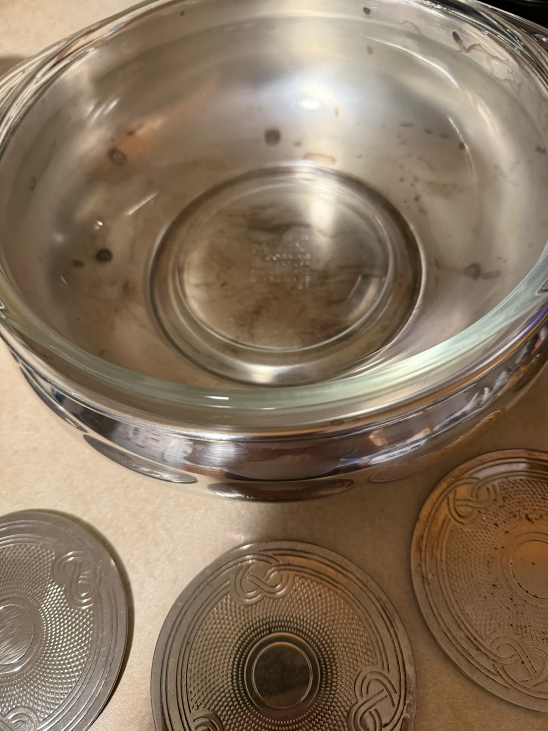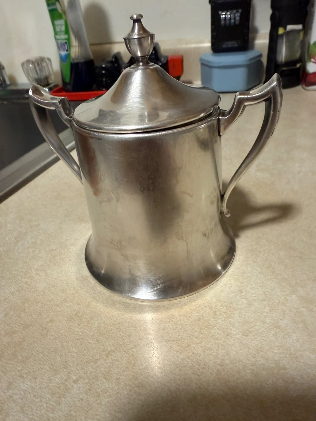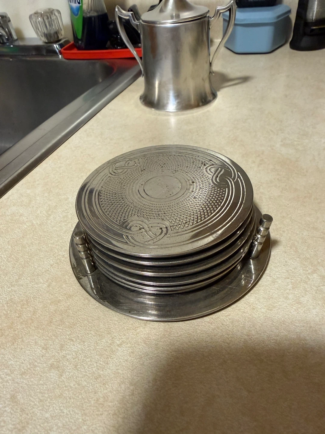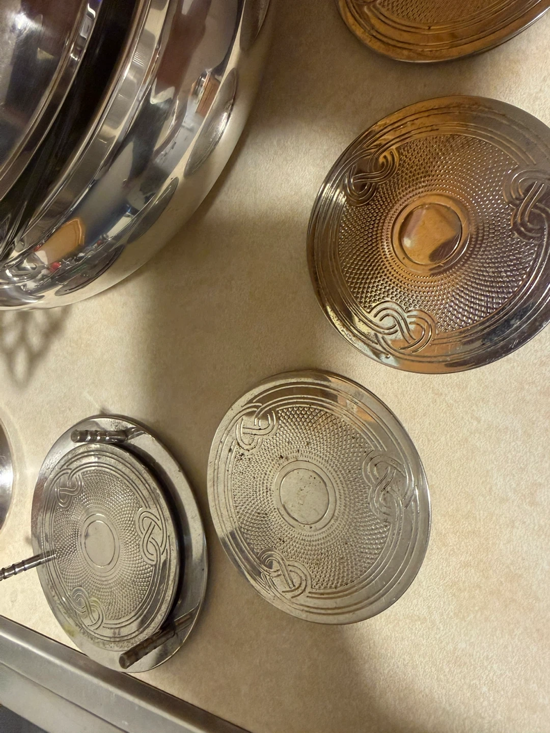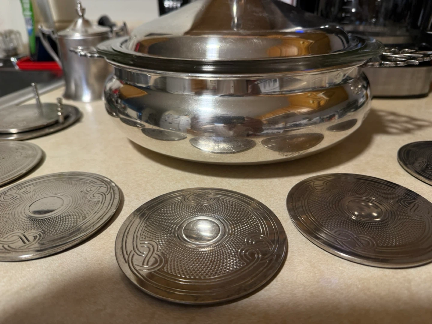 Selling a vintage silver plated serving set, including a covered sugar bowl, a serving bowl with glass insert, and six coasters. The set has a classic design and would be a lovely addition to any table setting. It shows some signs of wear consistent with age, but is overall in good condition.
