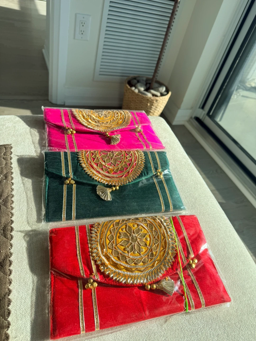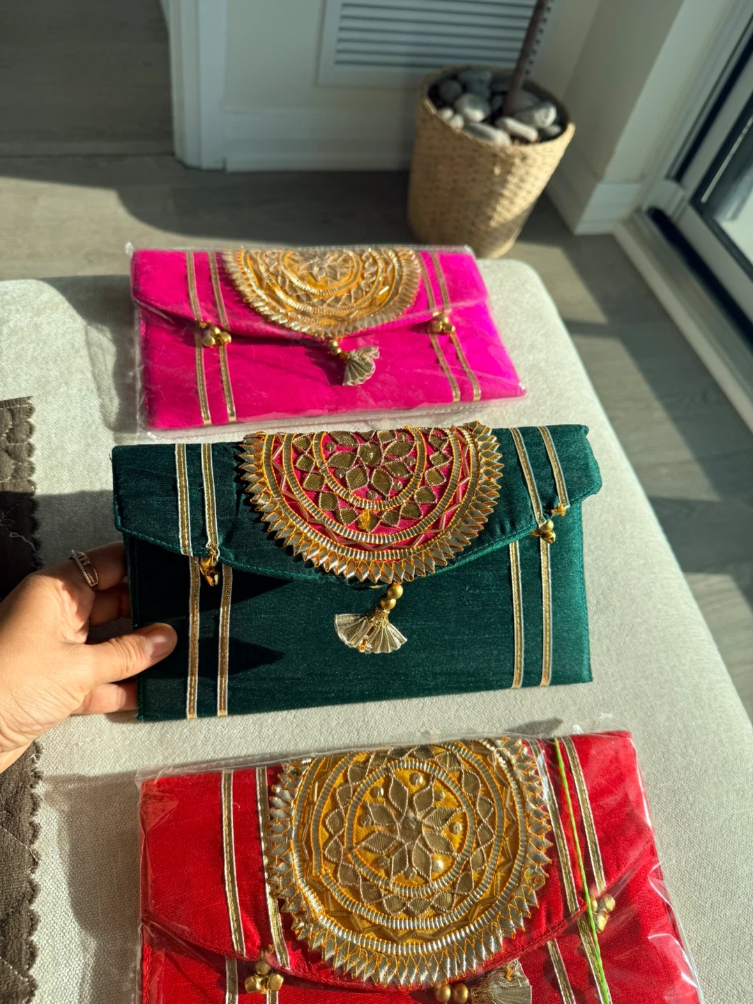 Brand new Colourful embroidered clutches. Each clutch is adorned with intricate gold detailing and tassels. Perfect for special occasions or to add a pop of colour to any outfit or gifting