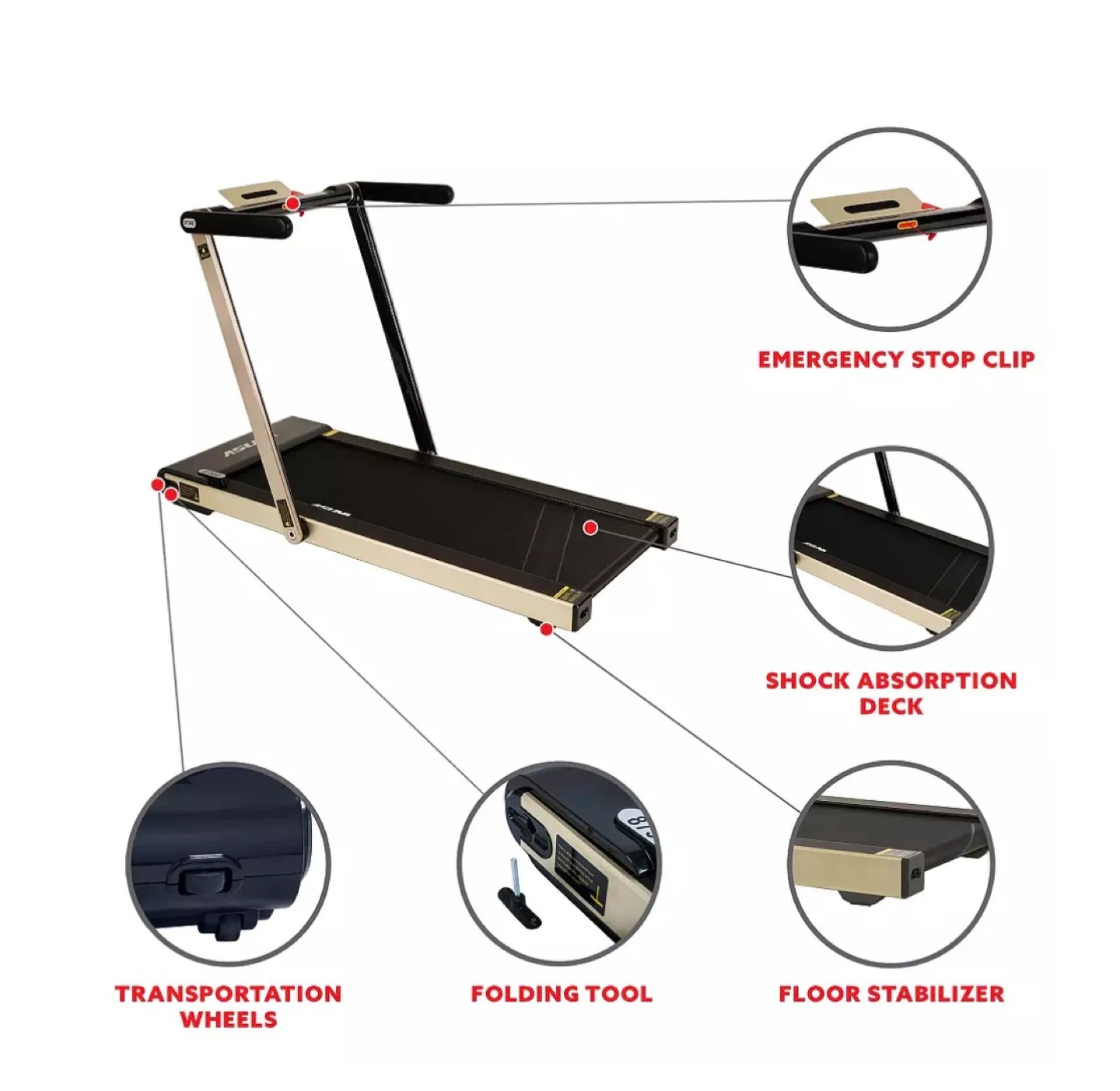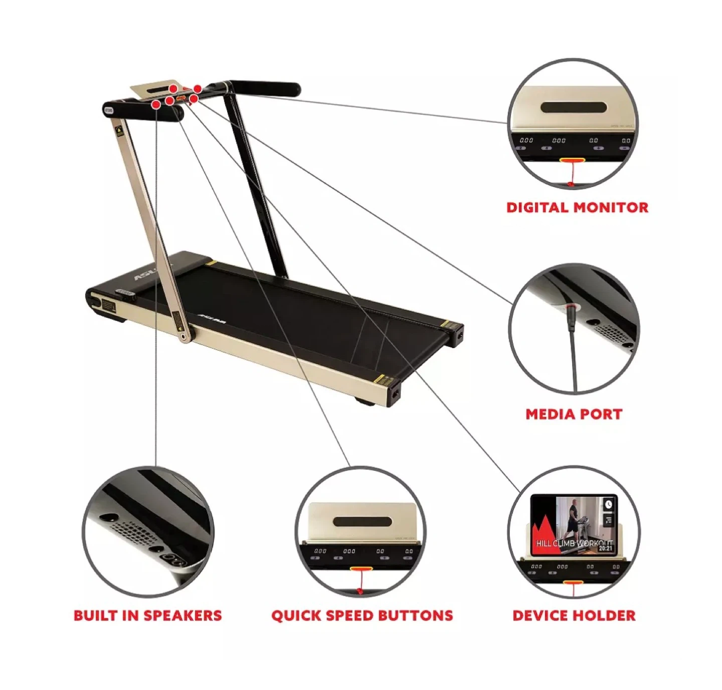 This Asuna Slim Motorized Treadmill offers a compact workout solution. It features a digital monitor, media port, and built-in speakers. Shock absorption deck and floor stabilizers are included for a comfortable and stable run. Foldable to store away when not in use. Fits under the bed when folded.