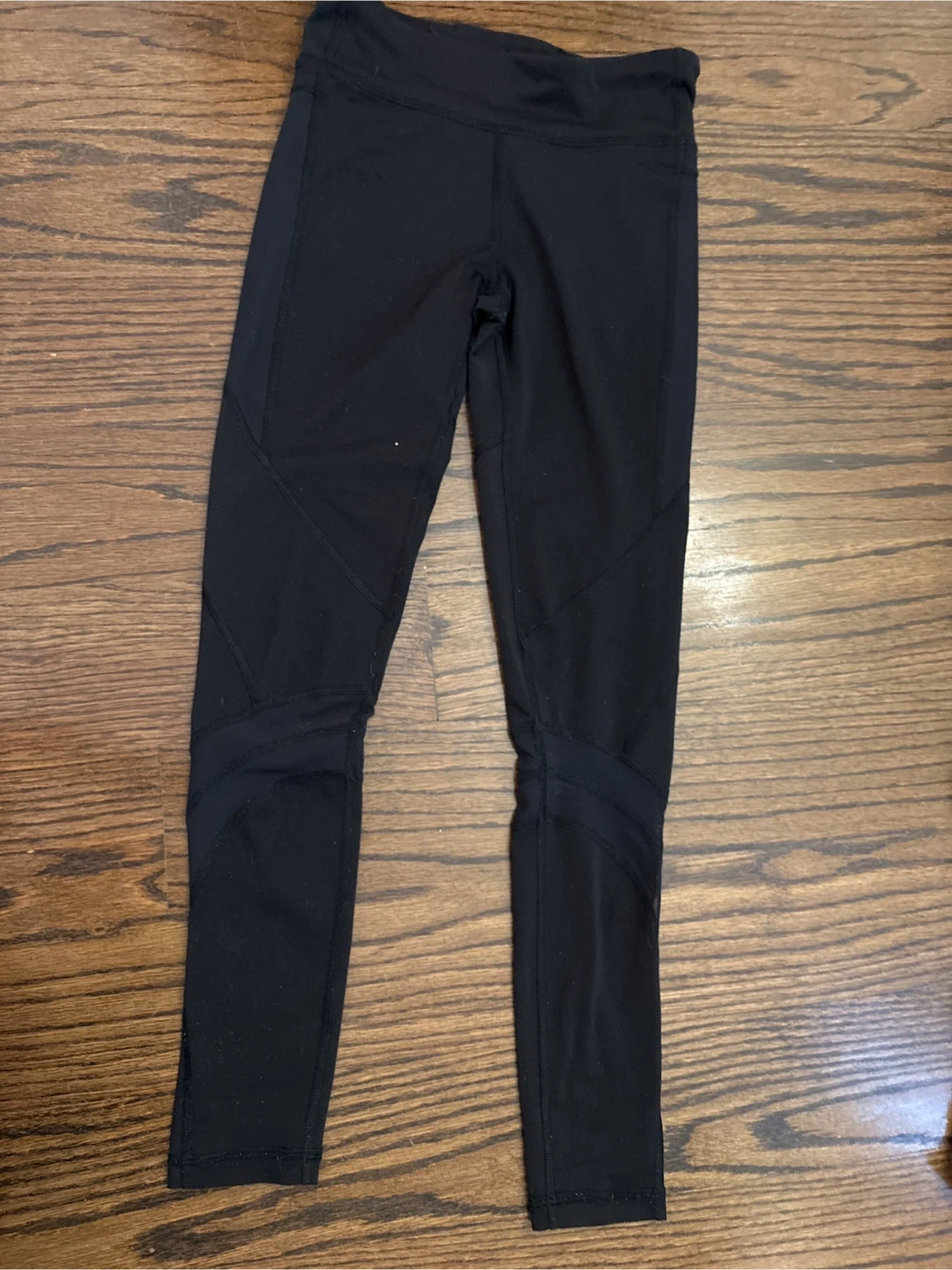 Black leggings with mesh panel detailing on the lower legs and side pocket. They feature a comfortable, high-waisted fit. Bought from Ivivva