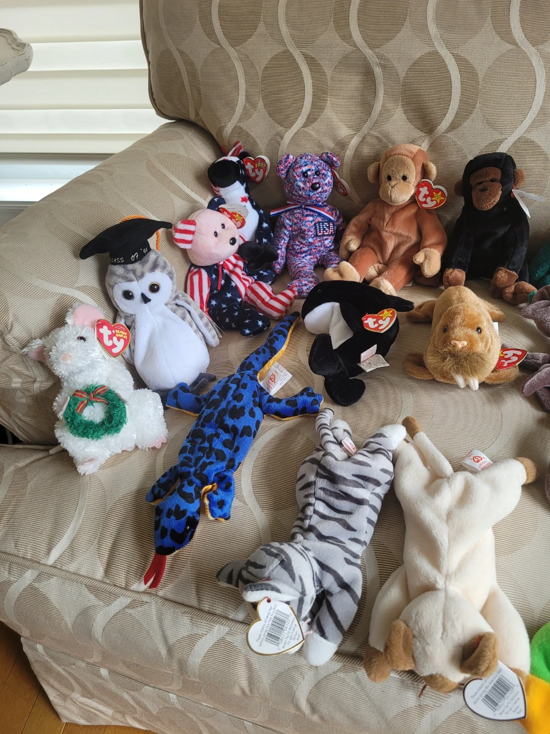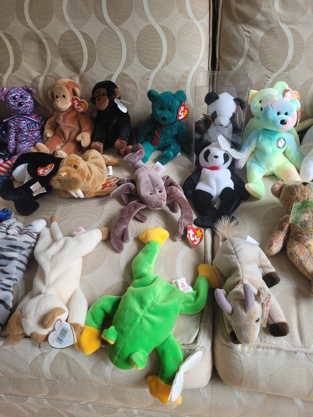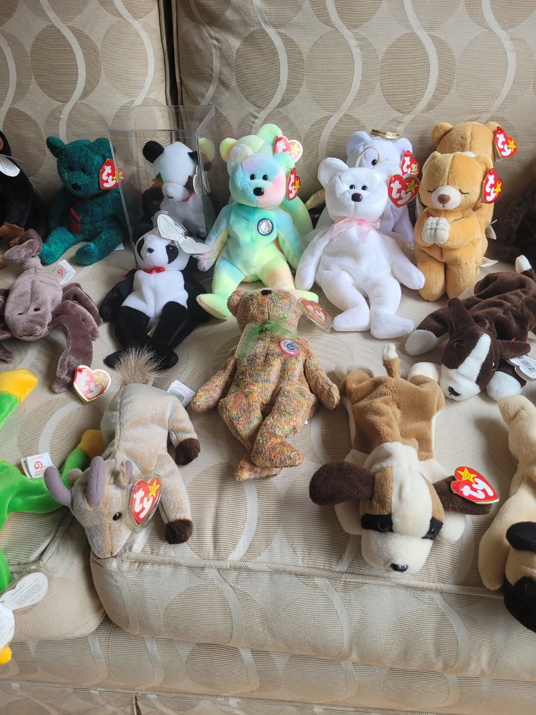Selling a large collection of Ty Beanie Babies. Features various animals and characters. All have their original tags with the exception of 1995 Lizzy Lizard. Some have plastic tag protectors, 1 has a clear case.