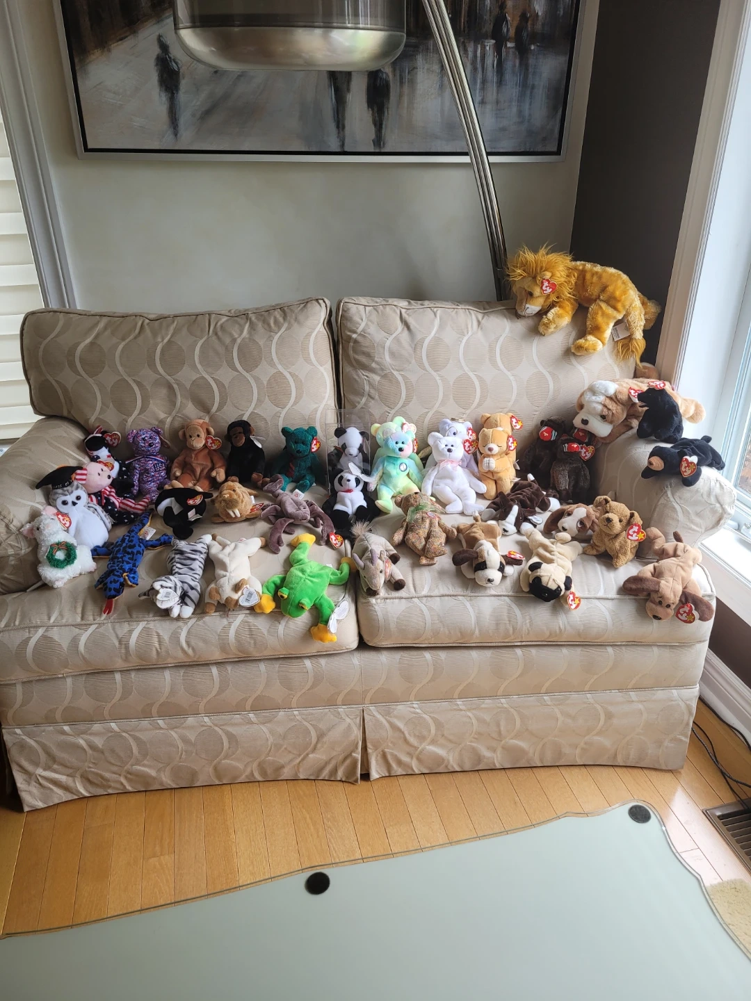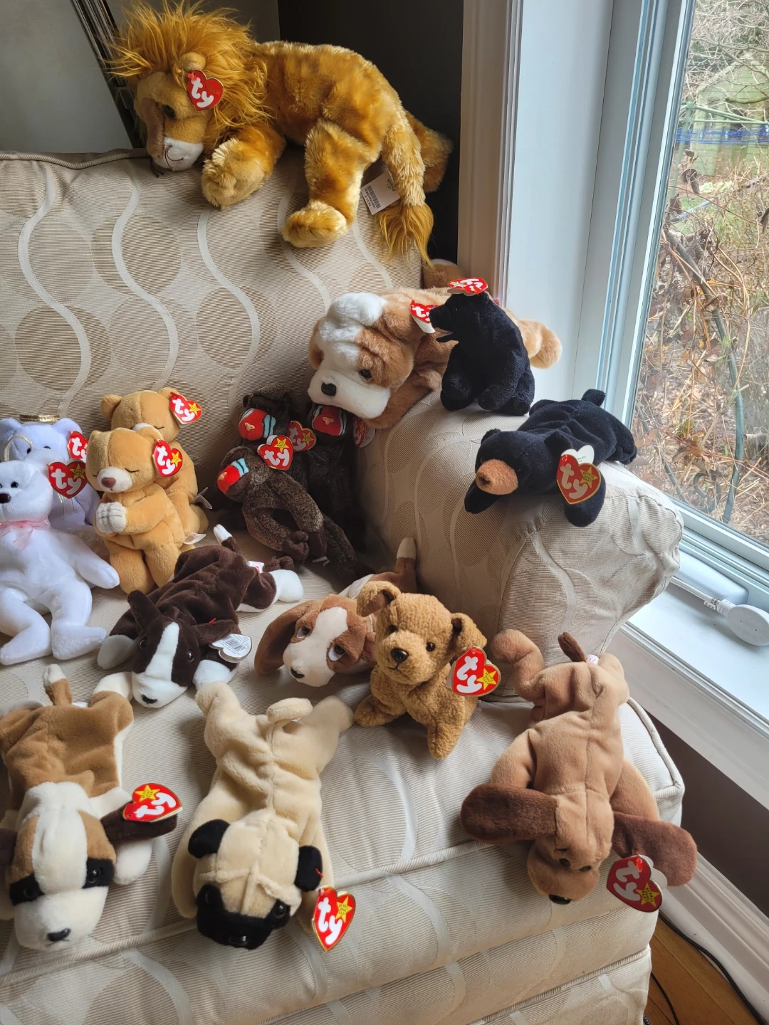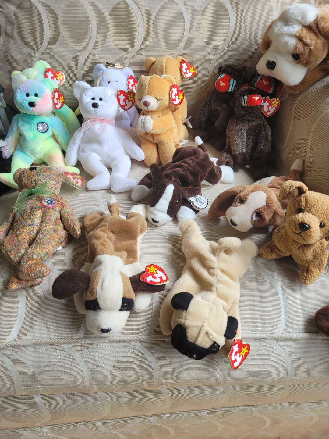 Selling a large collection of Ty Beanie Babies. Features various animals and characters. All have their original tags with the exception of 1995 Lizzy Lizard. Some have plastic tag protectors, 1 has a clear case.