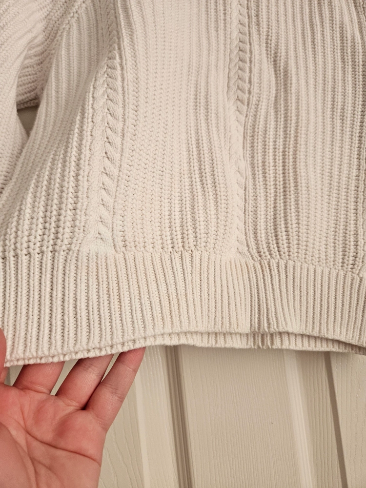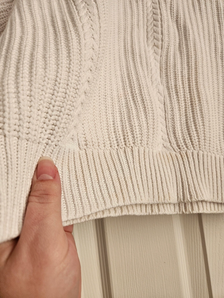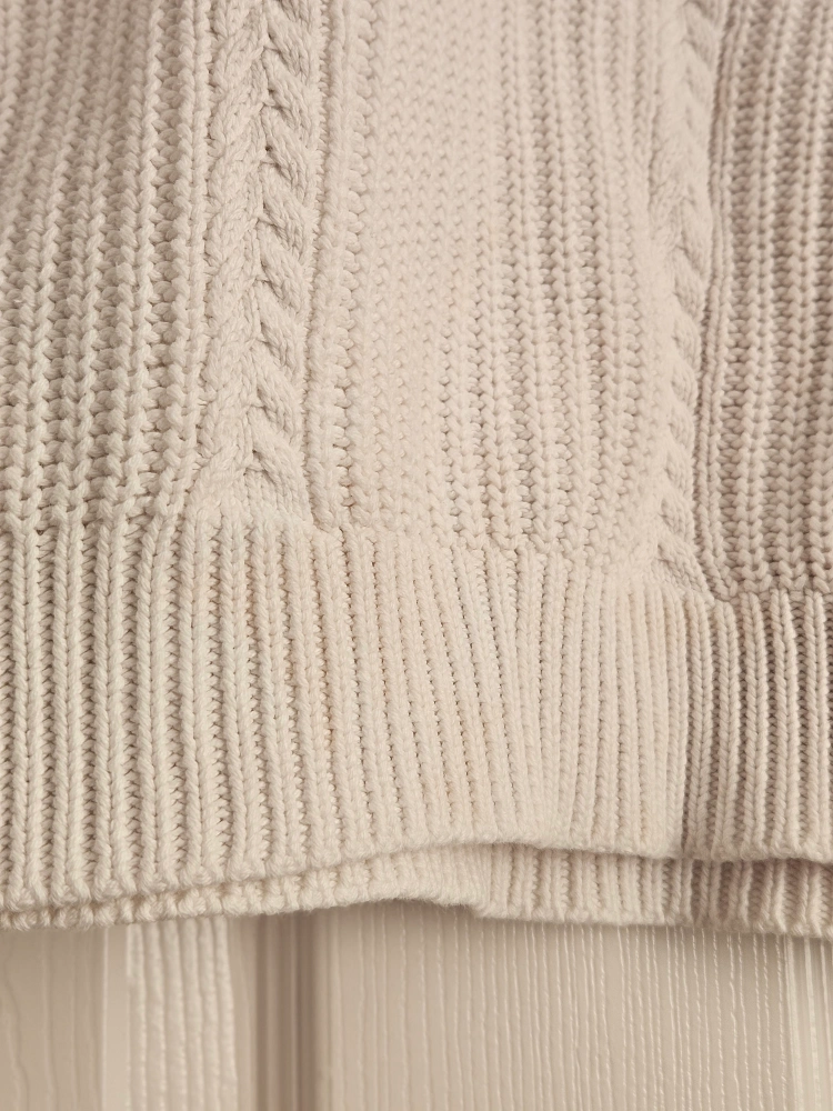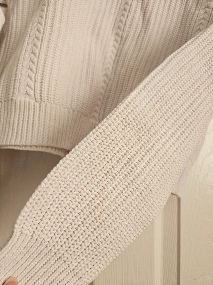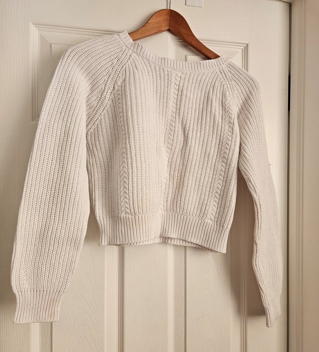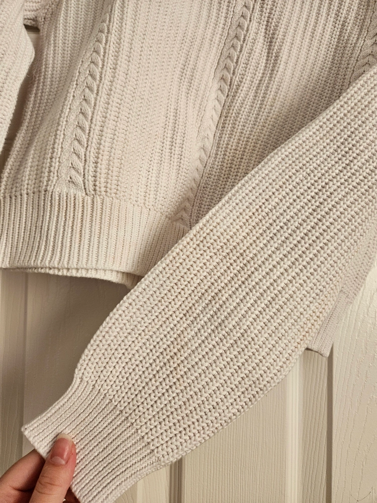 Off-white cropped sweater. Features cable knit detailing and long sleeves. Soft material, comfortable fit. Perfect for layering or wearing alone.
