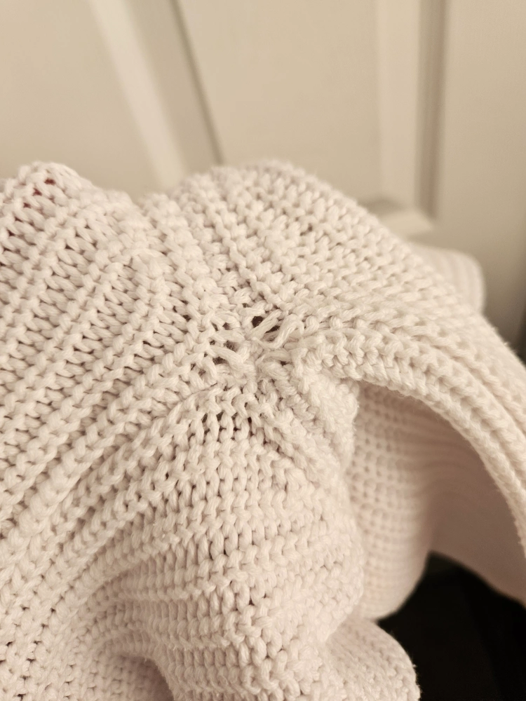 It's got some very light pinkish staining across the sweater, would be from washing it with colorful clothes. Not sure what happened, I tried washing it but it didn't help. Perhaps someone else would wanna try some other tricks to save it? Otherwise it's a good sweater.