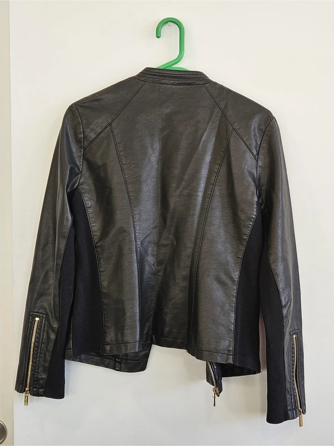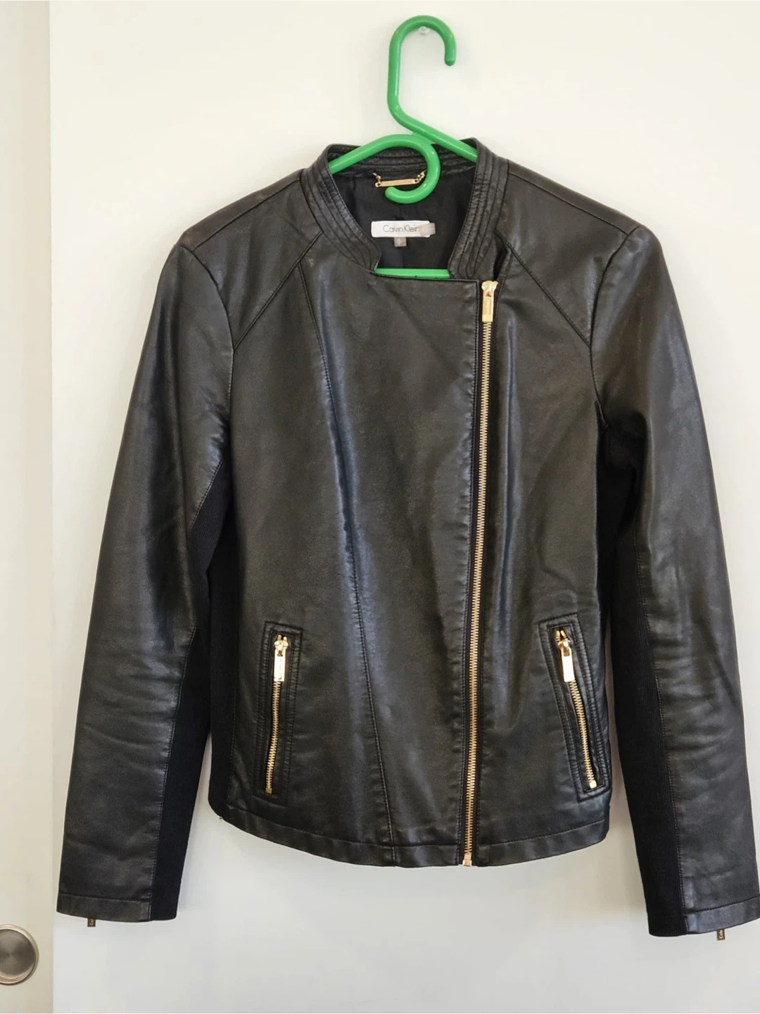 This Calvin Klein jacket is black with gold-tone hardware. It's a size small, featuring a faux leather exterior and ribbed fabric panels on the sleeves. It's a classic moto style with an asymmetrical zip closure and zippered pockets.