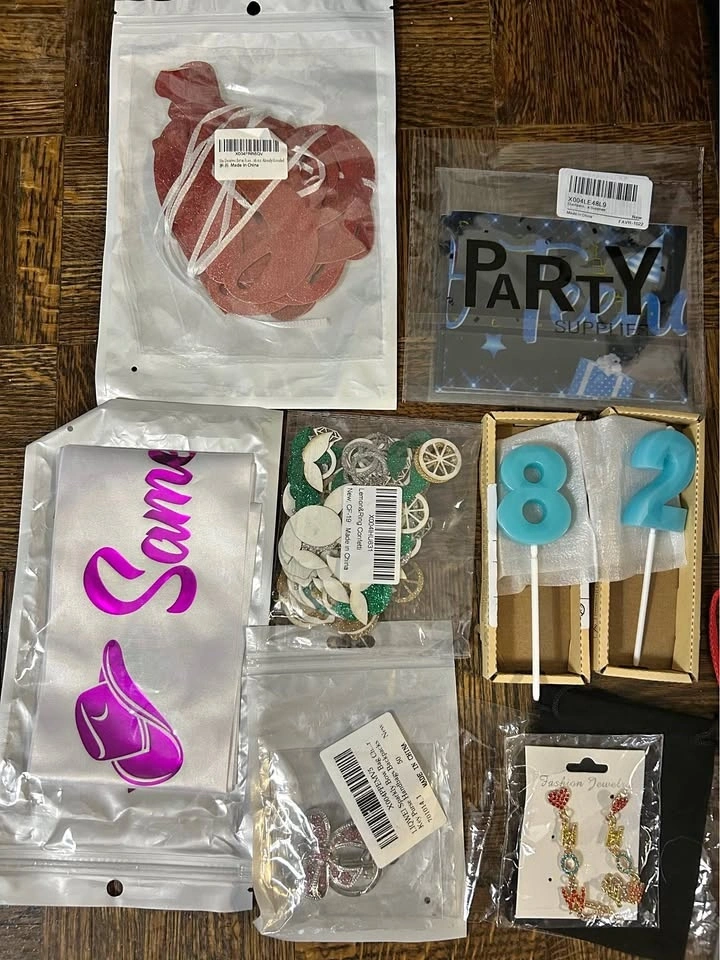 Party decor bundle – everything for $15. Includes: Cowboy sash, “Howdy” earrings, number candles (8 & 2), party banner, bow keychain, and a “She Deserves Better” rose gold glitter banner (already threaded – great for bachelor, retirement, going away, farewell, or new job party).