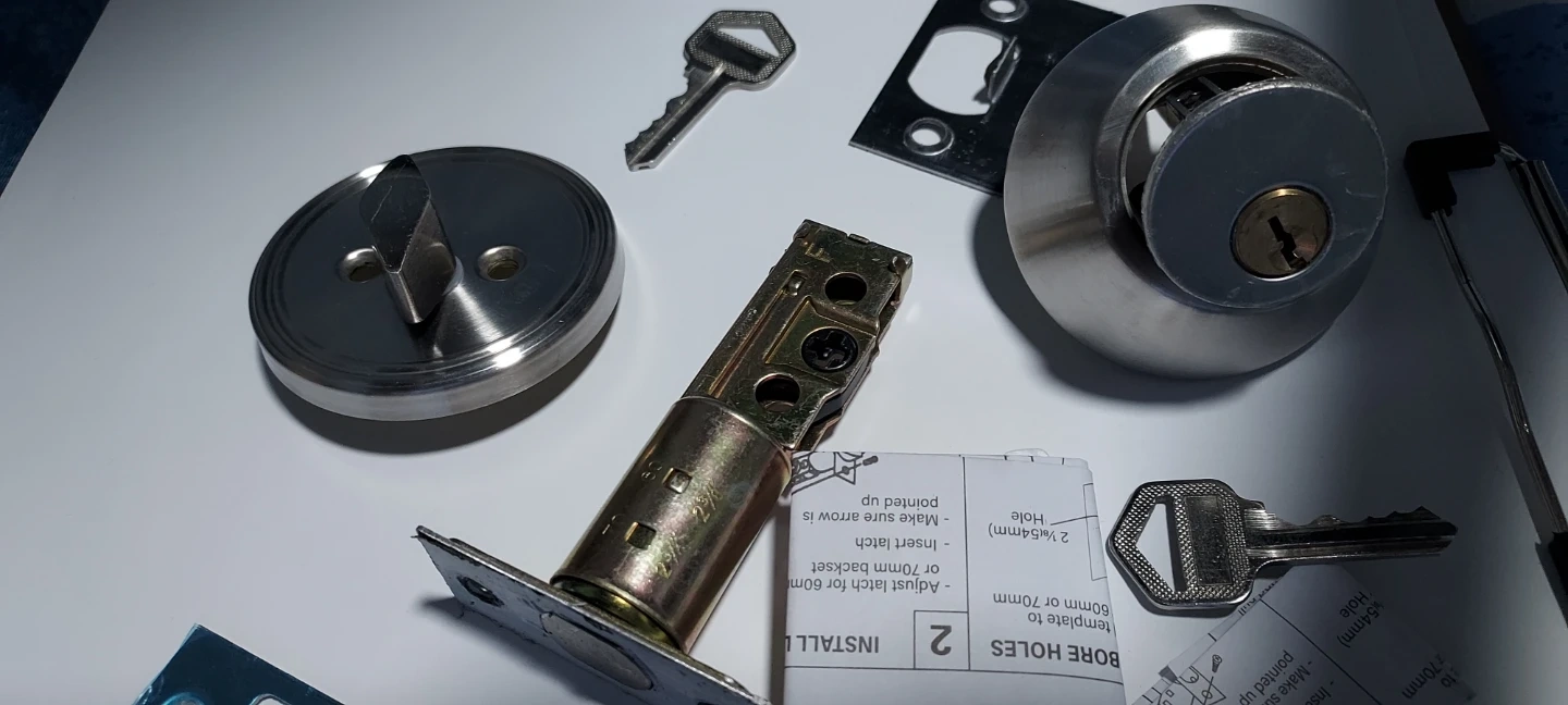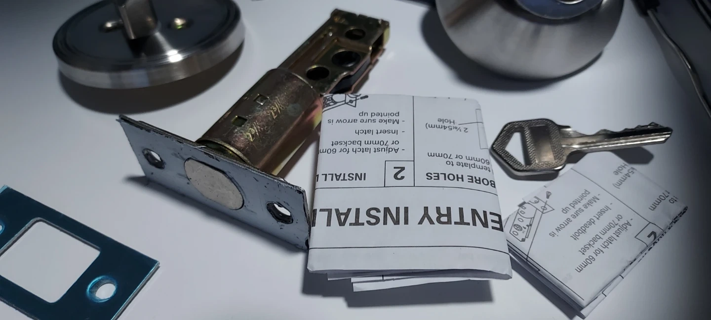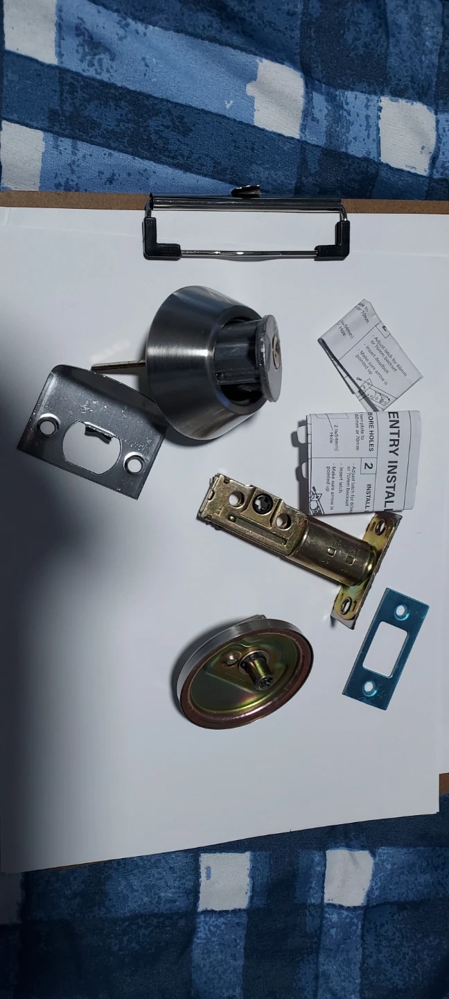Selling an entry install deadbolt lock set. It comes with the necessary components for installation, including the latch, strike plate, and keys. Please refer to the included instructions for proper installation.