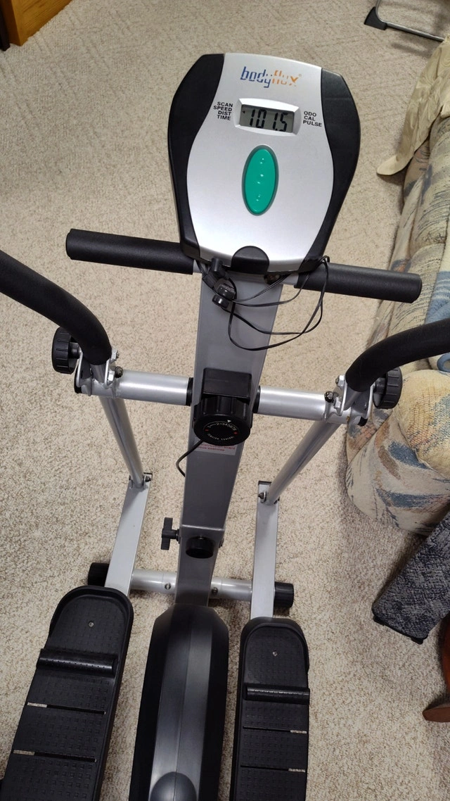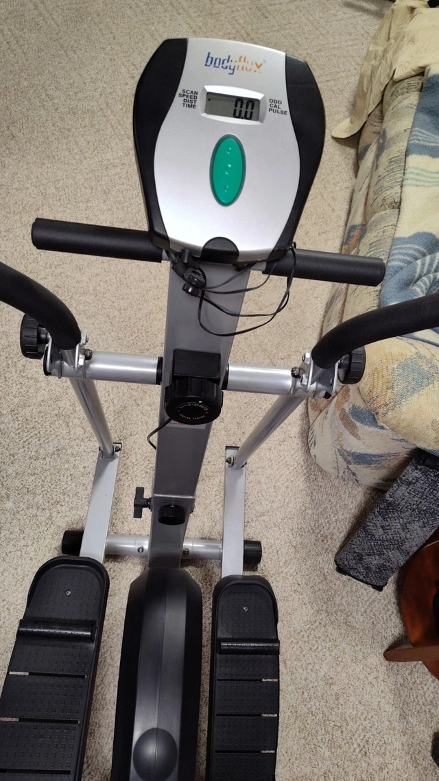 This elliptical exercise machine by Body Flex features multiple adjustments and a scan function. It's in new condition. We are downsizing, and unfortunately, I must sell it. It is a unique and excellent piece of equipment. Pick up in Mississauga, near Britannia Road and Ninth Line.
