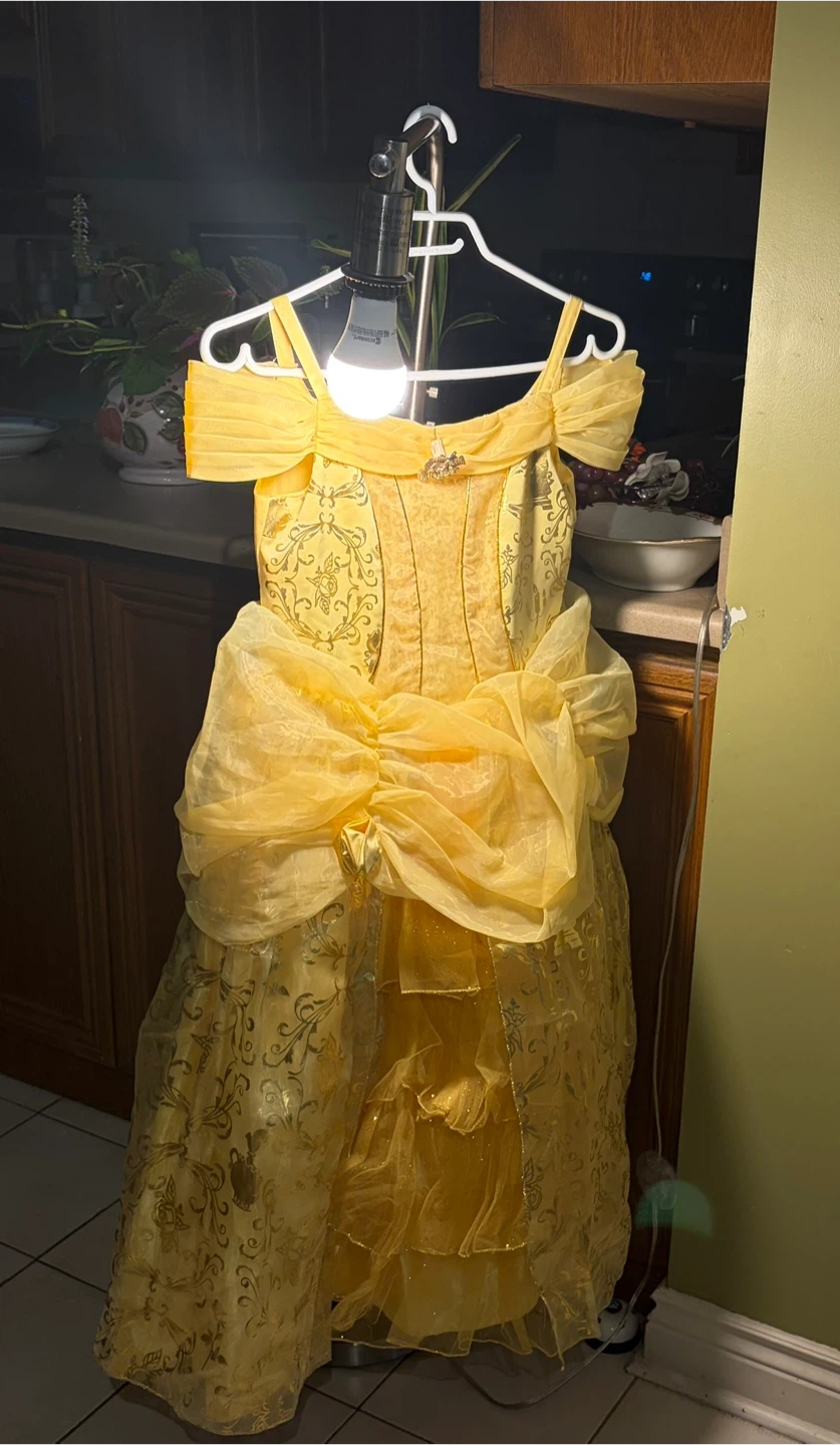 A yellow Belle-inspired dress with intricate gold patterns and ruffled skirt layers. It features off-the-shoulder puff sleeves and a large bow accent at the waist. This dress is perfect for dress-up or a costume party!