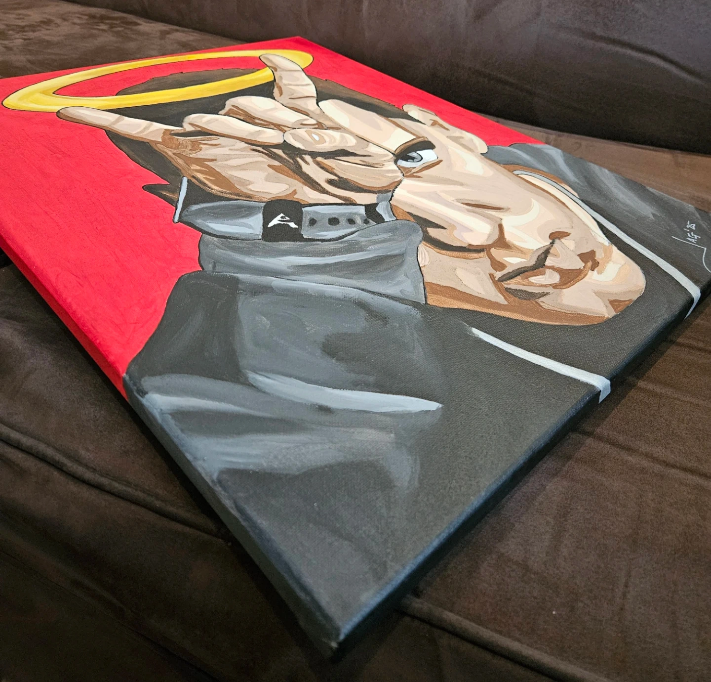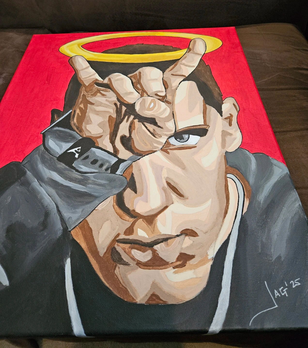 A 16"x20" canvas painting featuring a portrait of Eminem with a halo and a hand gesture. Acrylic paint on stretched canvas. This original artwork is signed. Red background with grey and brown tones for the subject. Artwork for wall display, a must have for every fan.
