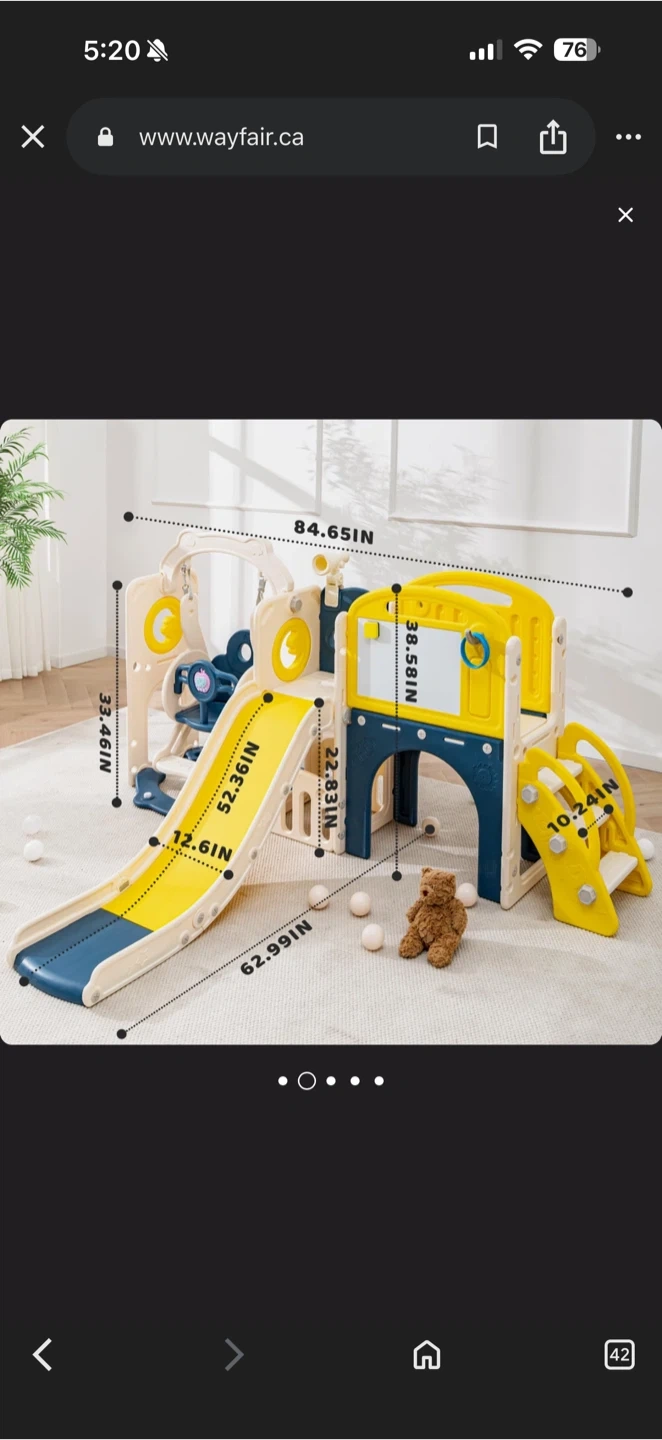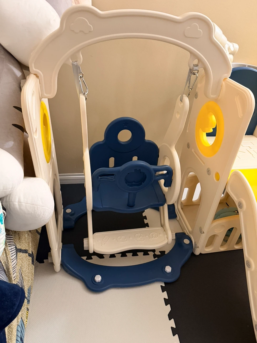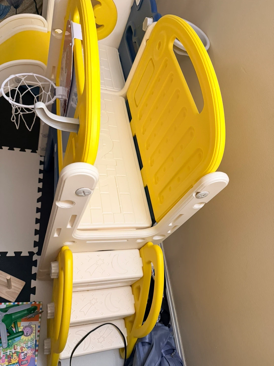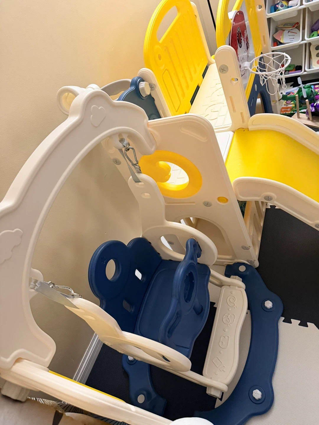This indoor playground features a swing, slide, and basketball hoop. It's made of durable plastic in blue, yellow, and white. Perfect for toddlers and young children for indoor active play!