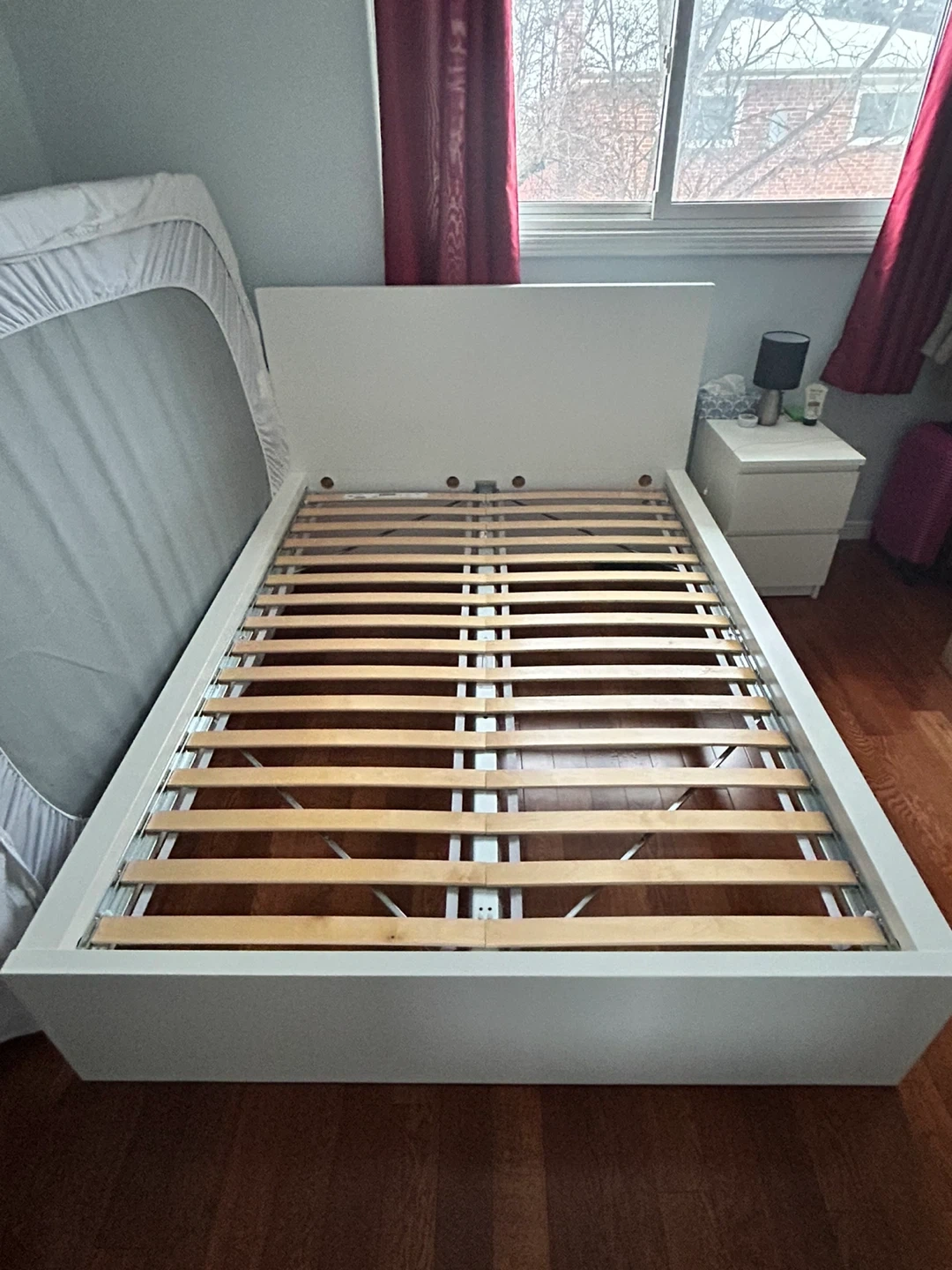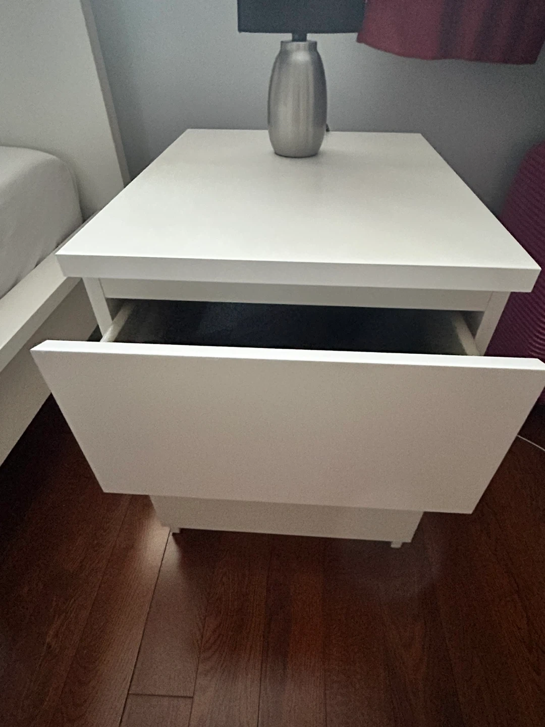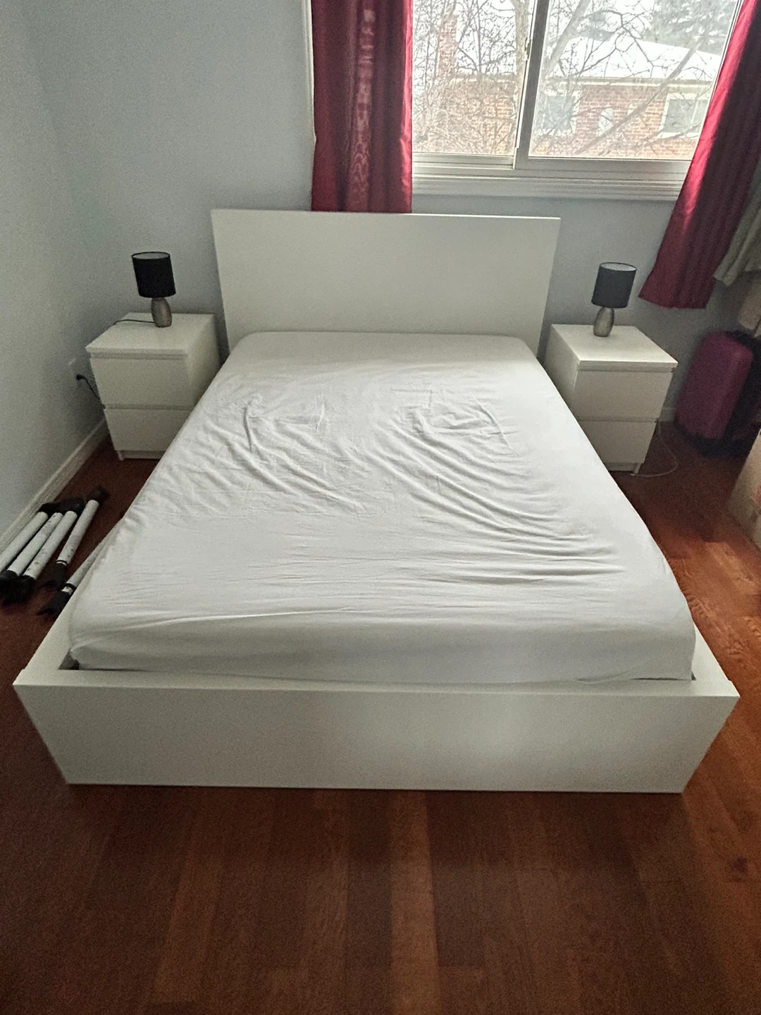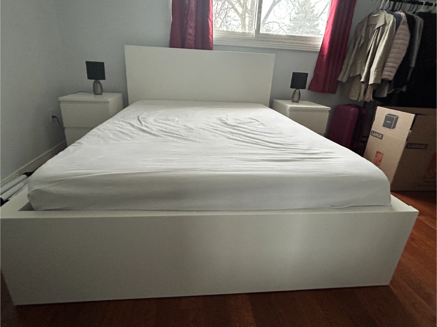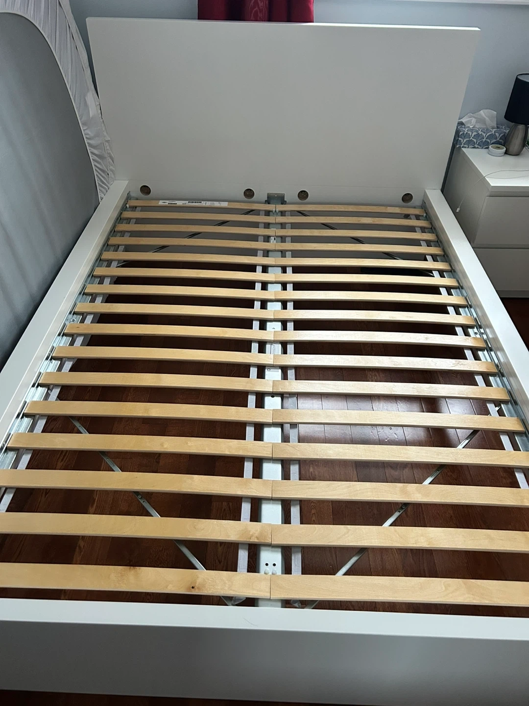 White Queen bed frame with a modern headboard. Includes two matching white nightstands, each with drawers for storage. Slatted bed base included.