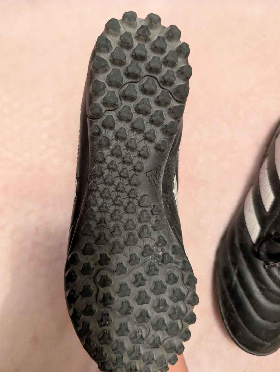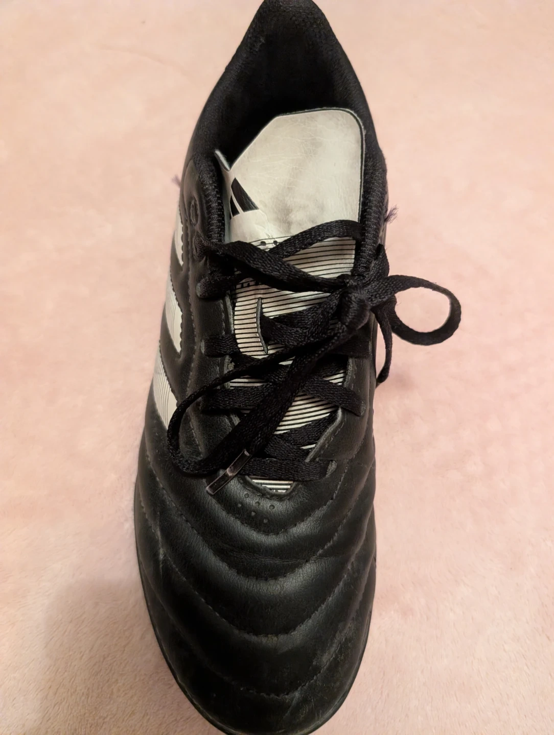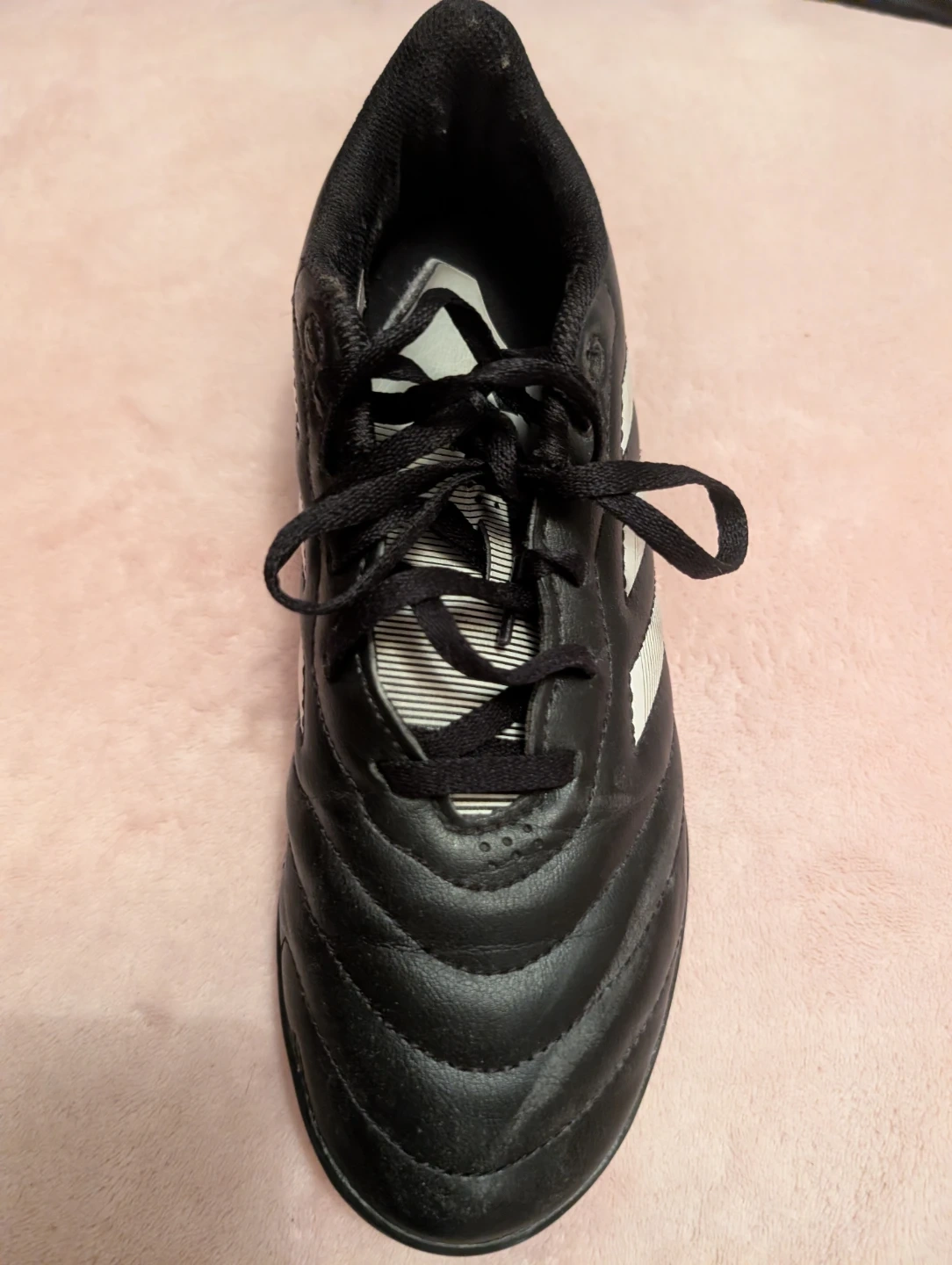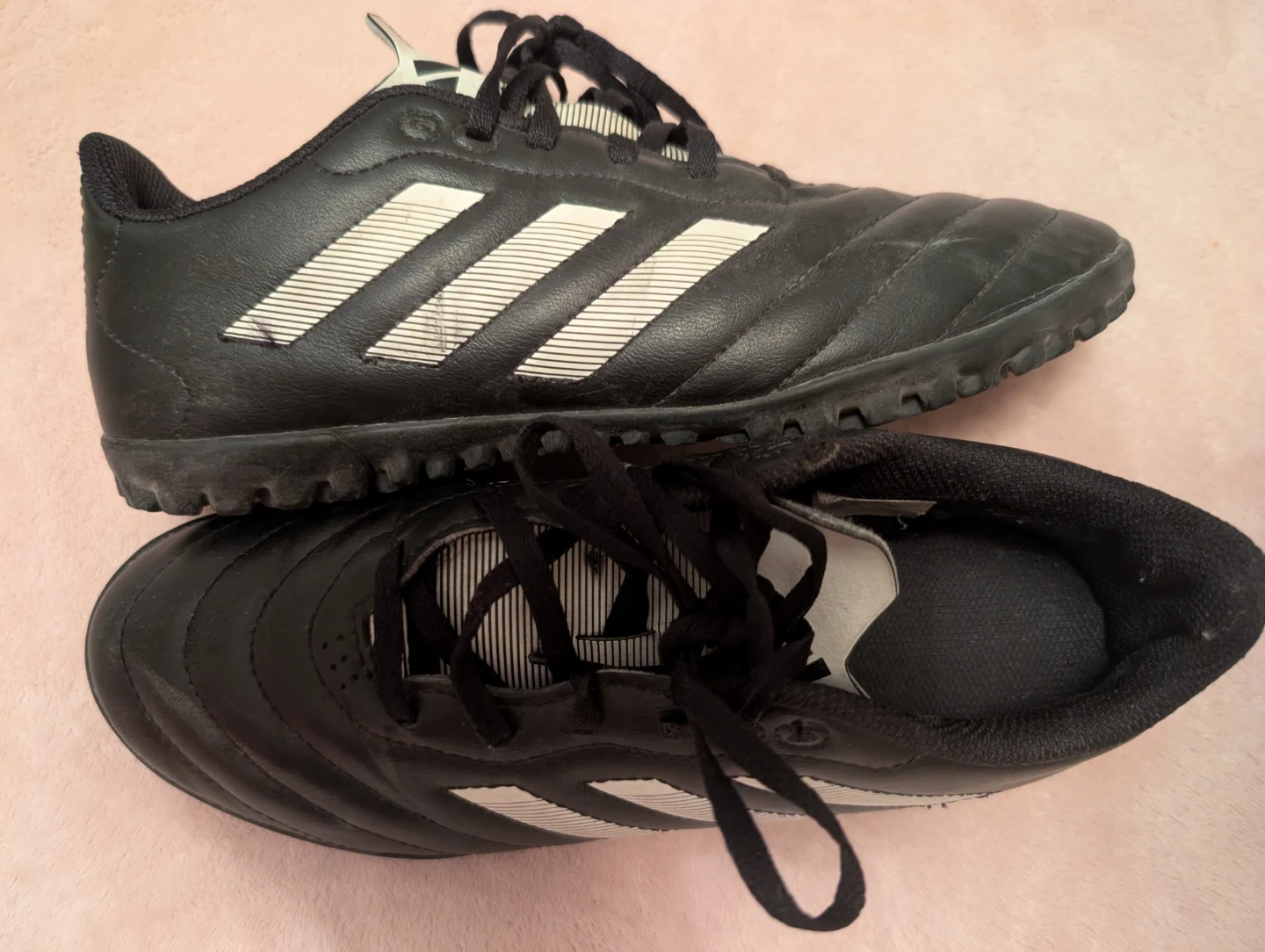 Black Adidas soccer cleats with white stripes.Size 6. These cleats feature a durable synthetic upper and a rubber outsole with cleats for traction. These are turf shoes.