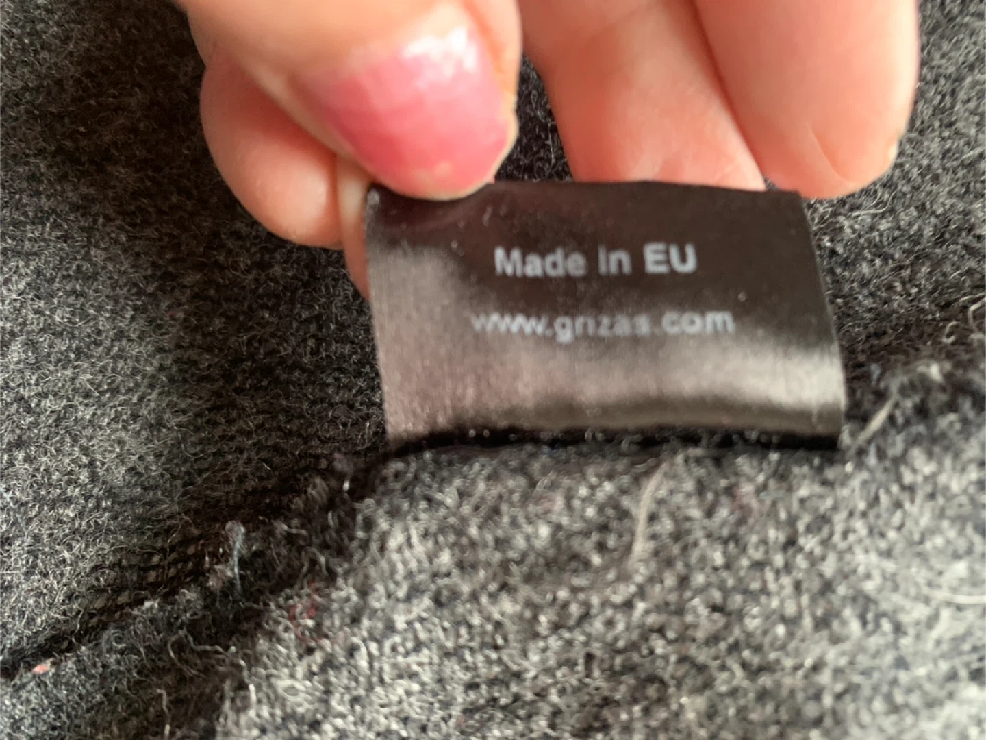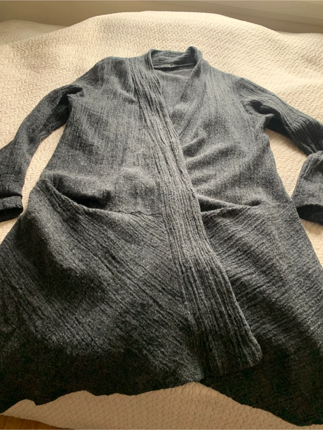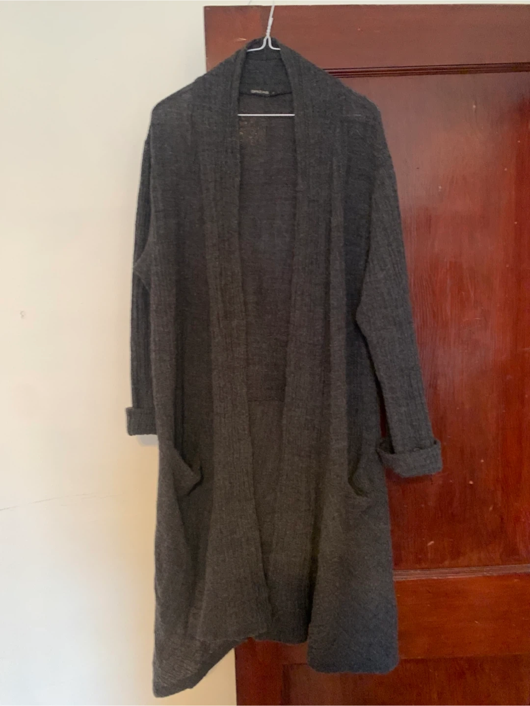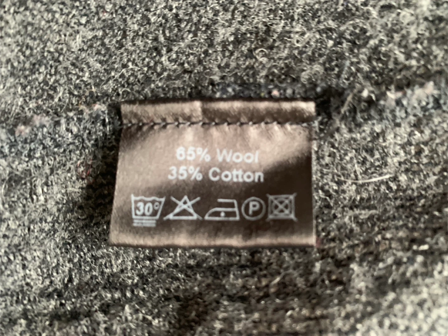 This cardigan is made from a blend of 65% wool and 35% cotton. It's a dark grey colour and features two front pockets. Made in the EU.