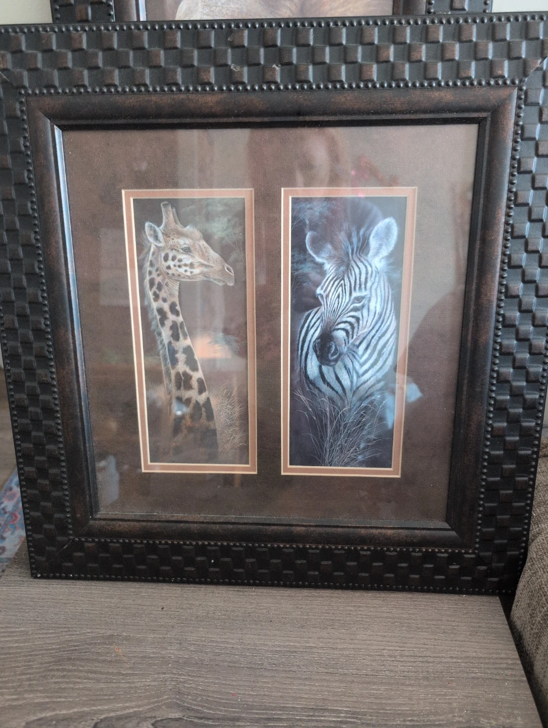 This set includes two framed prints: one featuring elephants and another with a giraffe and zebra. The frames have a dark, textured finish. They're ready to add a touch of nature to your decor.