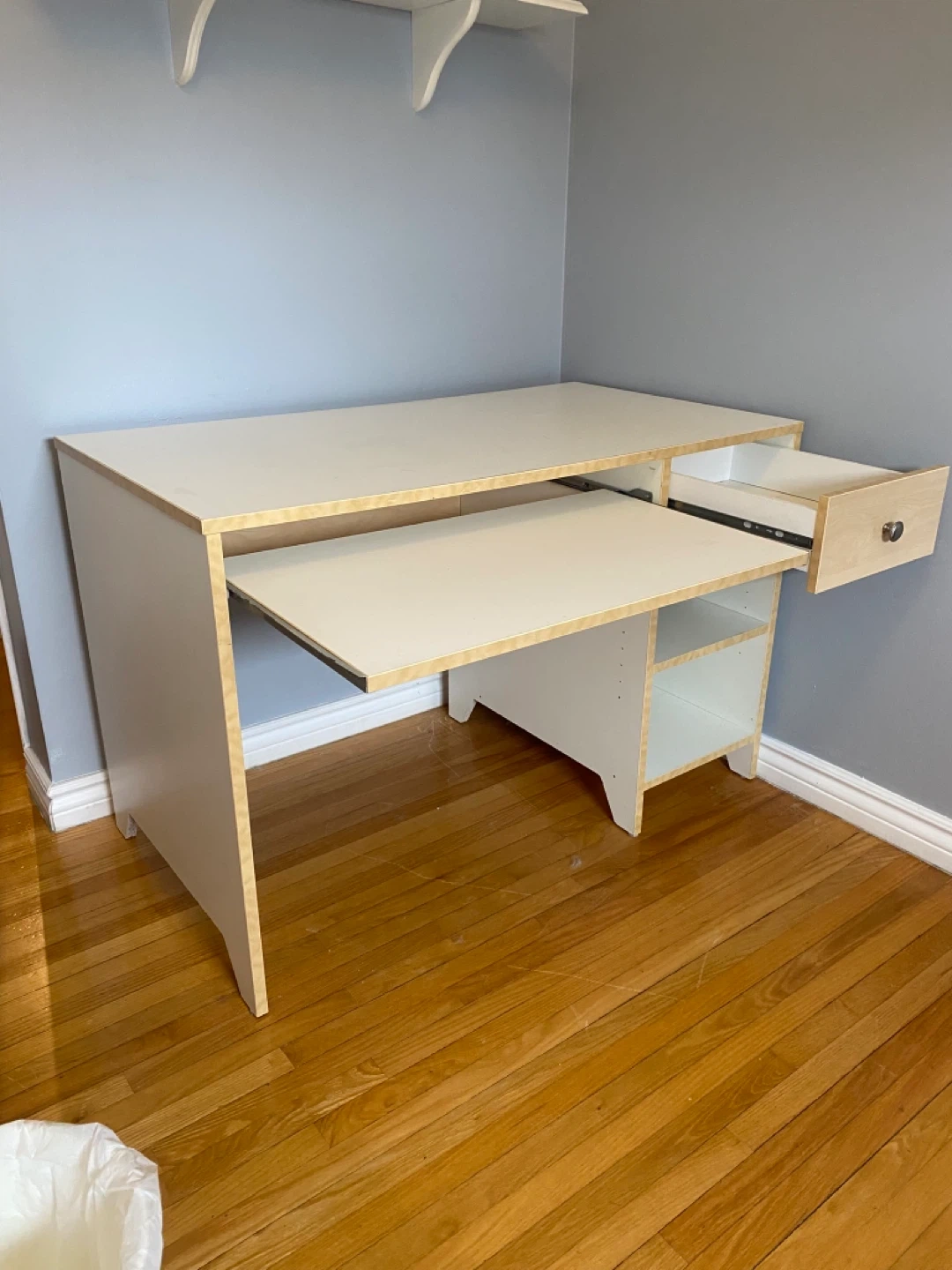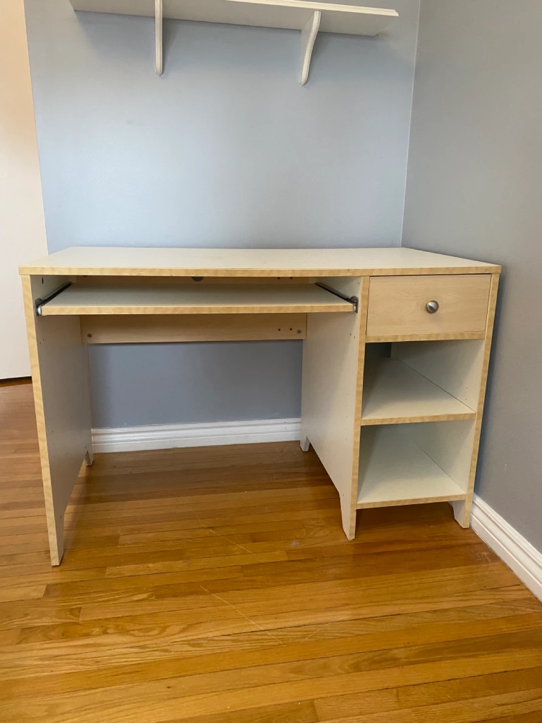 This desk features a pull-out keyboard tray and a single drawer for storage. It also includes two open shelves built into the side unit. It's made of a light-coloured wood composite. Some minor imperfections on desk.