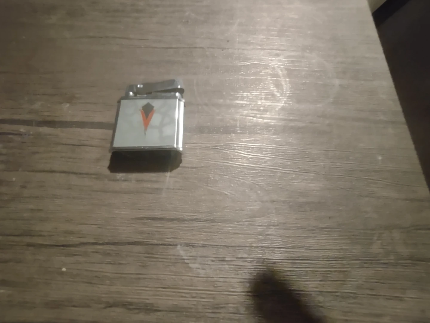 A vintage lighter with a distinctive red and orange emblem on the front. It appears to be made of metal. This lighter is a unique collectible item.