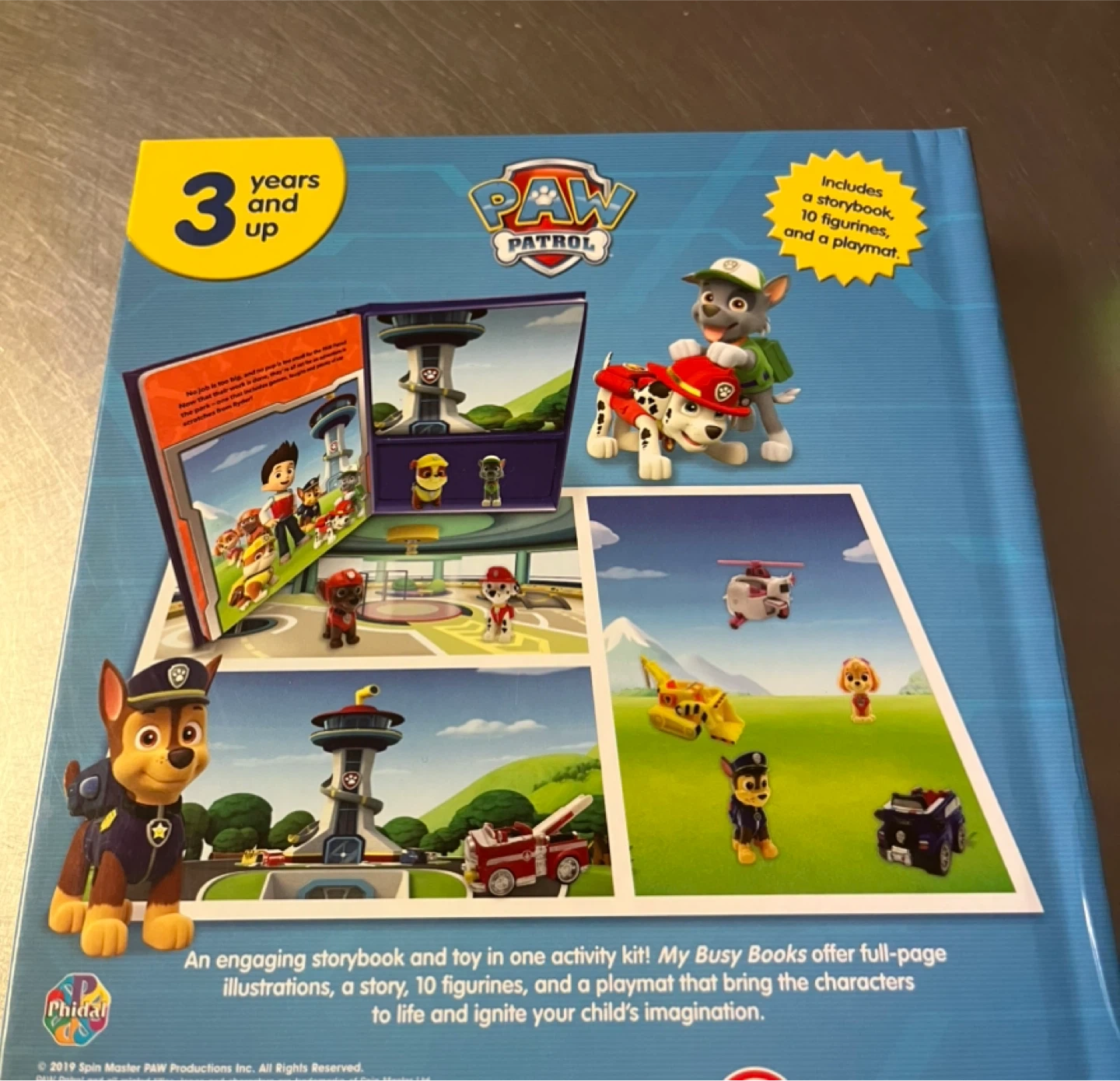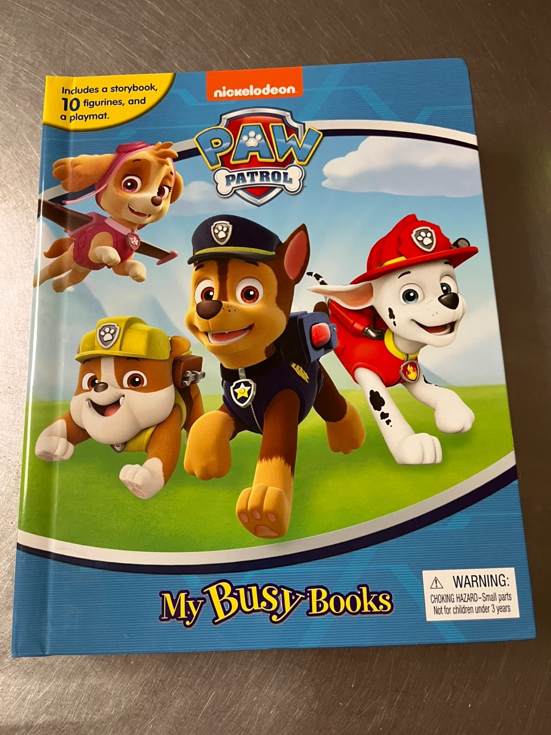 This Paw Patrol My Busy Books activity set includes a storybook, 10 figurines (missing one character) and a playmat.