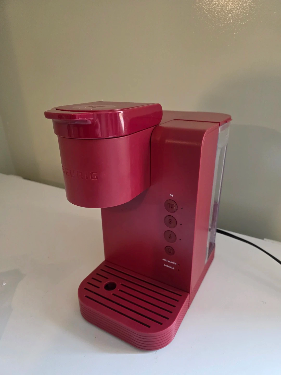 This red Keurig single-serve coffee maker is a compact appliance for brewing coffee. It has buttons for 6, 8, and 10 oz brew sizes. The unit has a removable water reservoir. It's great for quick individual servings of coffee.