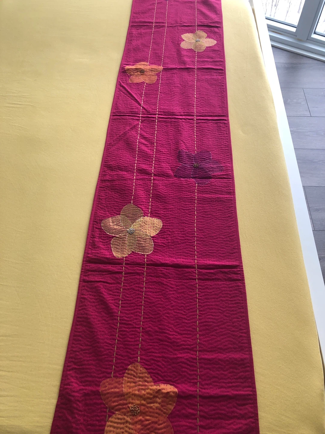 This vibrant pink table runner features embroidered floral appliques and textured fabric. It's made from a silk and cotton blend, offering a lovely drape. Perfect for adding a decorative touch to your dining table!