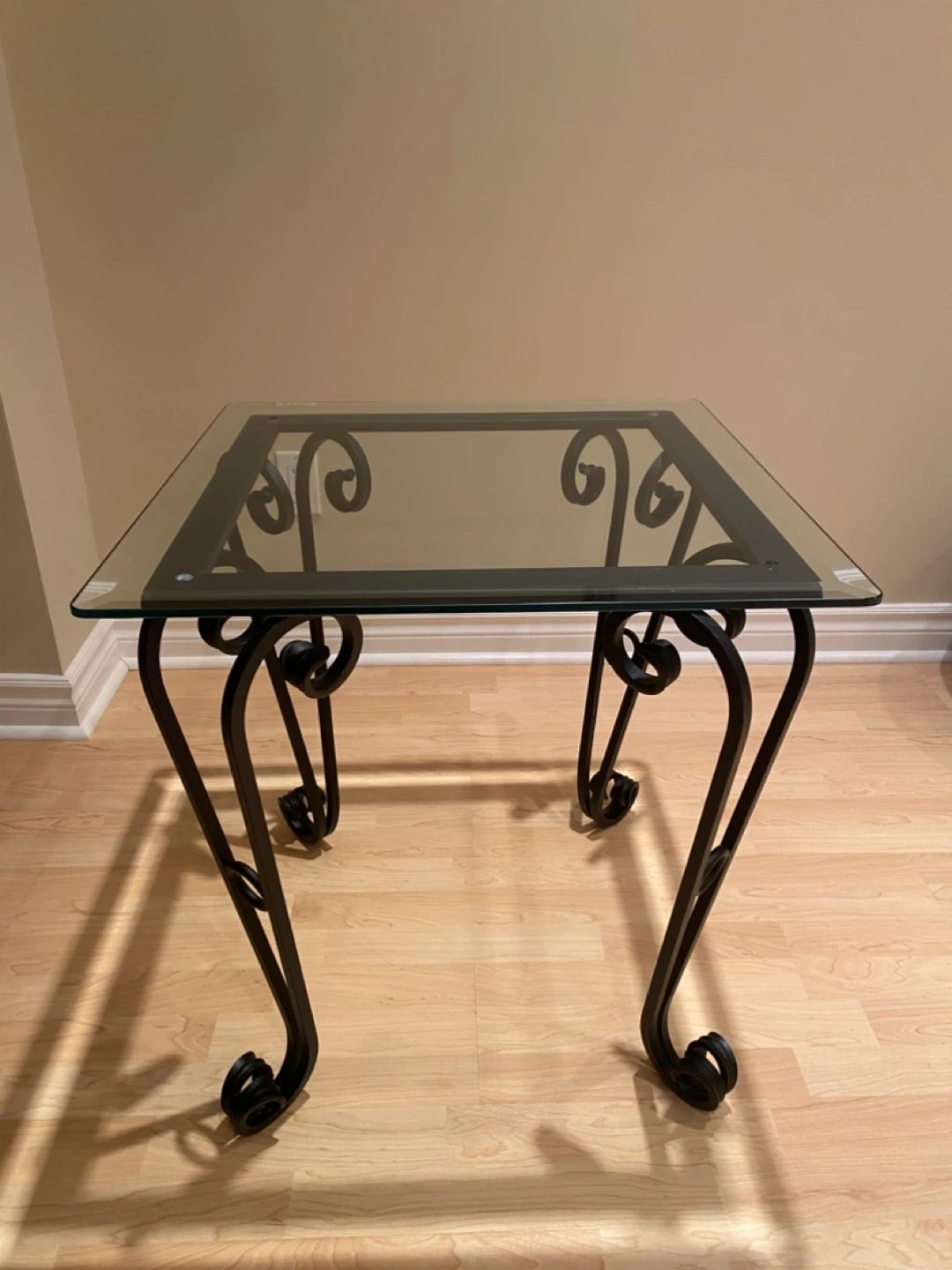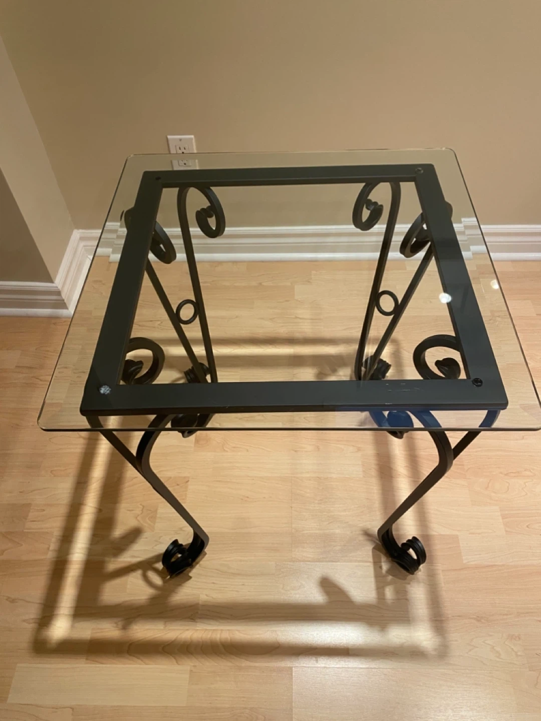 This square coffee table and end table features a clear glass top and a decorative wrought iron base. Its elegant design complements various living room styles.