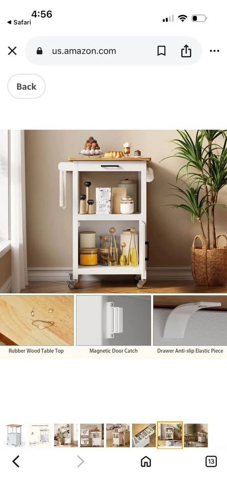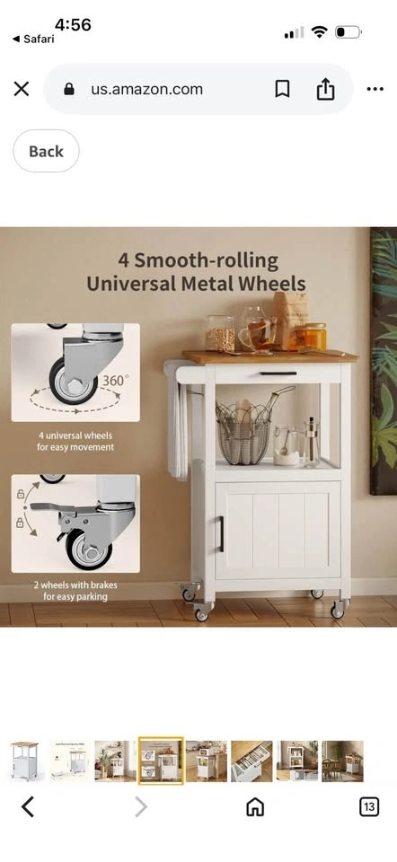 New in box! Kitchen Island Cart for Limited Space. This cart can provide your kitchen with extra storage space and keep it tidy. Features a slide-out drawer, an open storage area, and a cabinet with a door. The countertop is solid wood, perfect as a workspace. It has four 360° smooth-rolling metal wheels, with two lockable for stability. Easy assembly with included instructions and numbered parts. Overall Dimensions: 22.1"(W) x 18.3"(D) x 35"(H).