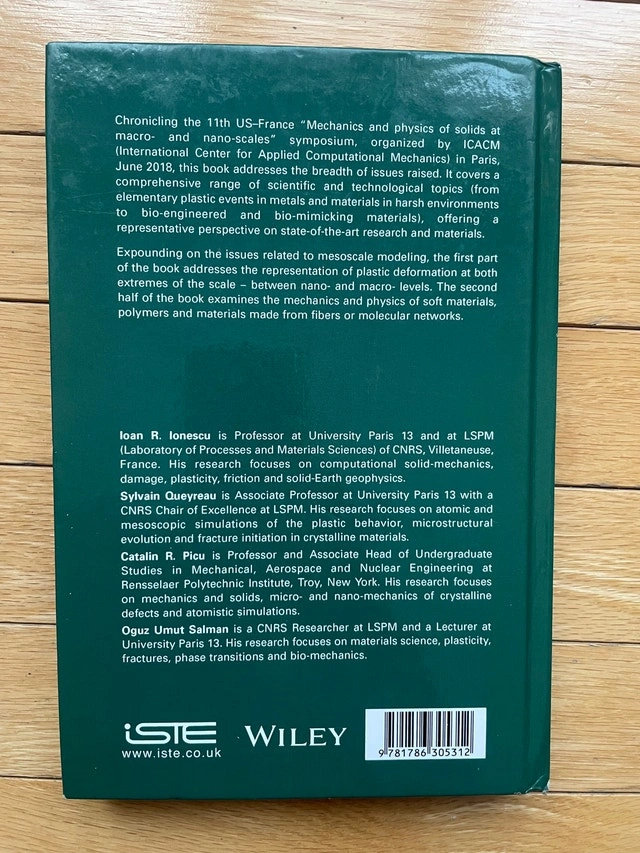 This book, "Mechanics and Physics of Solids at Micro- and Nano-Scales", is part of the Mechanical Engineering and Solid Mechanics Series. It covers a wide range of scientific and technological topics. Edited by Ioan R. Ionescu, Sylvain Queyreau, Catalin R. Picu, and Oguz Umut Salman. Published by ISTE, Wiley, first published in 2019. ISBN: 978-1-78630-531-2. The book is new with no markings, but has slight scuffs on the hardcover corners. If the ad is up, it's available! Cash is accepted.