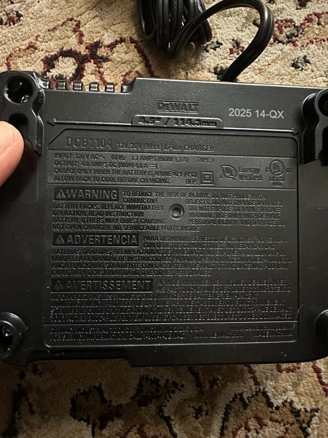 This is a DEWALT DCB1104 battery charger. It's designed for 12V and 20V MAX Lithium Ion batteries. The charger has indicators for Stage 1 charging, Stage 2 charging, and Pack Charged.