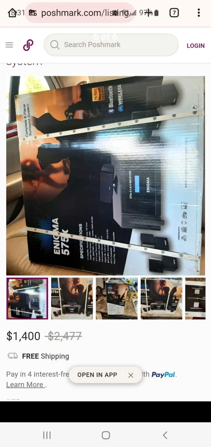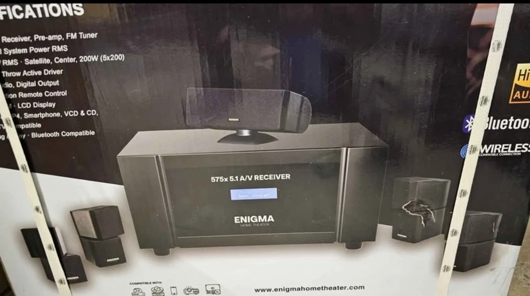 Complete 6-piece surround sound system with 8.1 amplifier receiver. It's Bluetooth compatible and has Hi-Res audio. Includes original box and packaging.