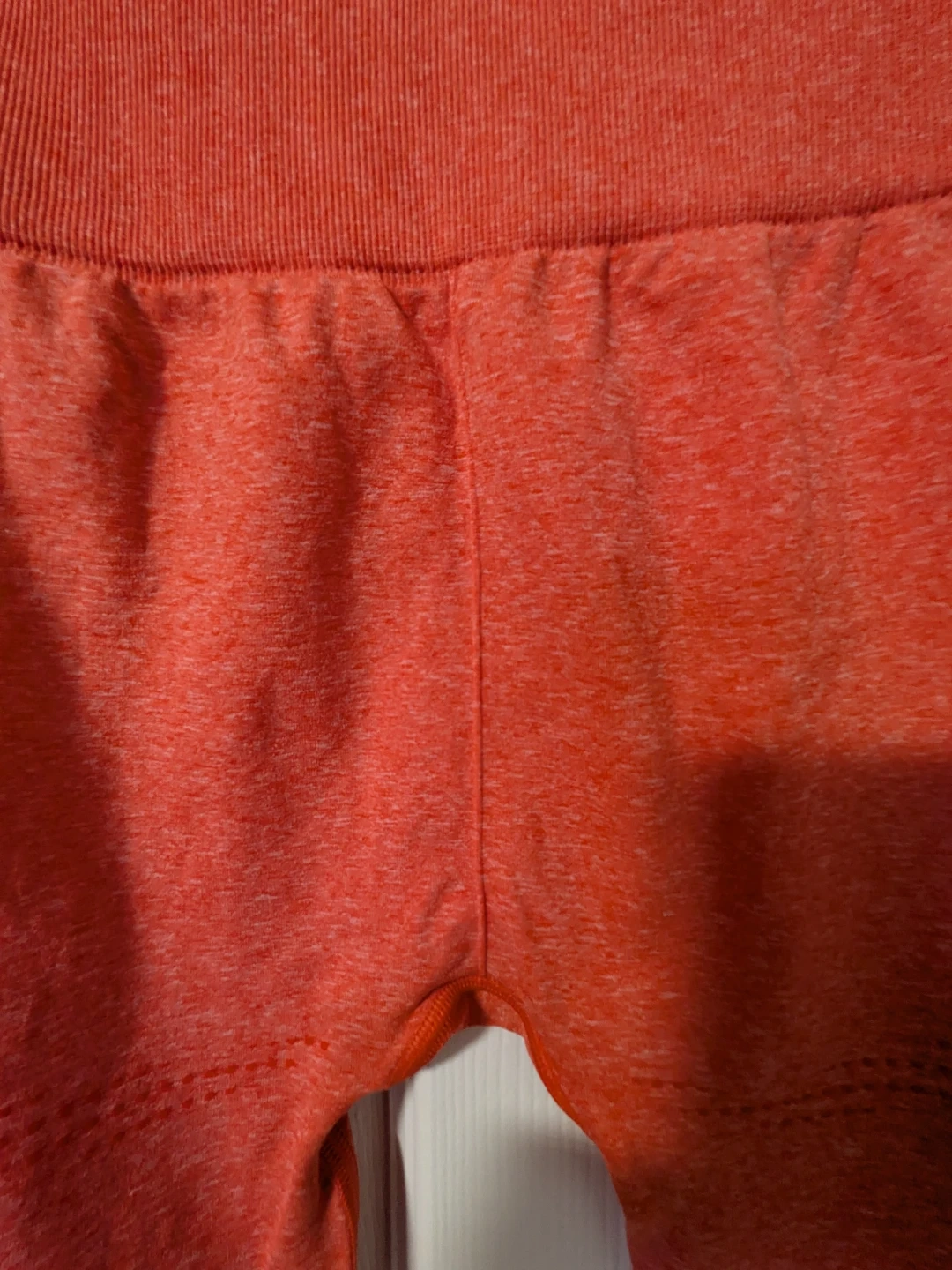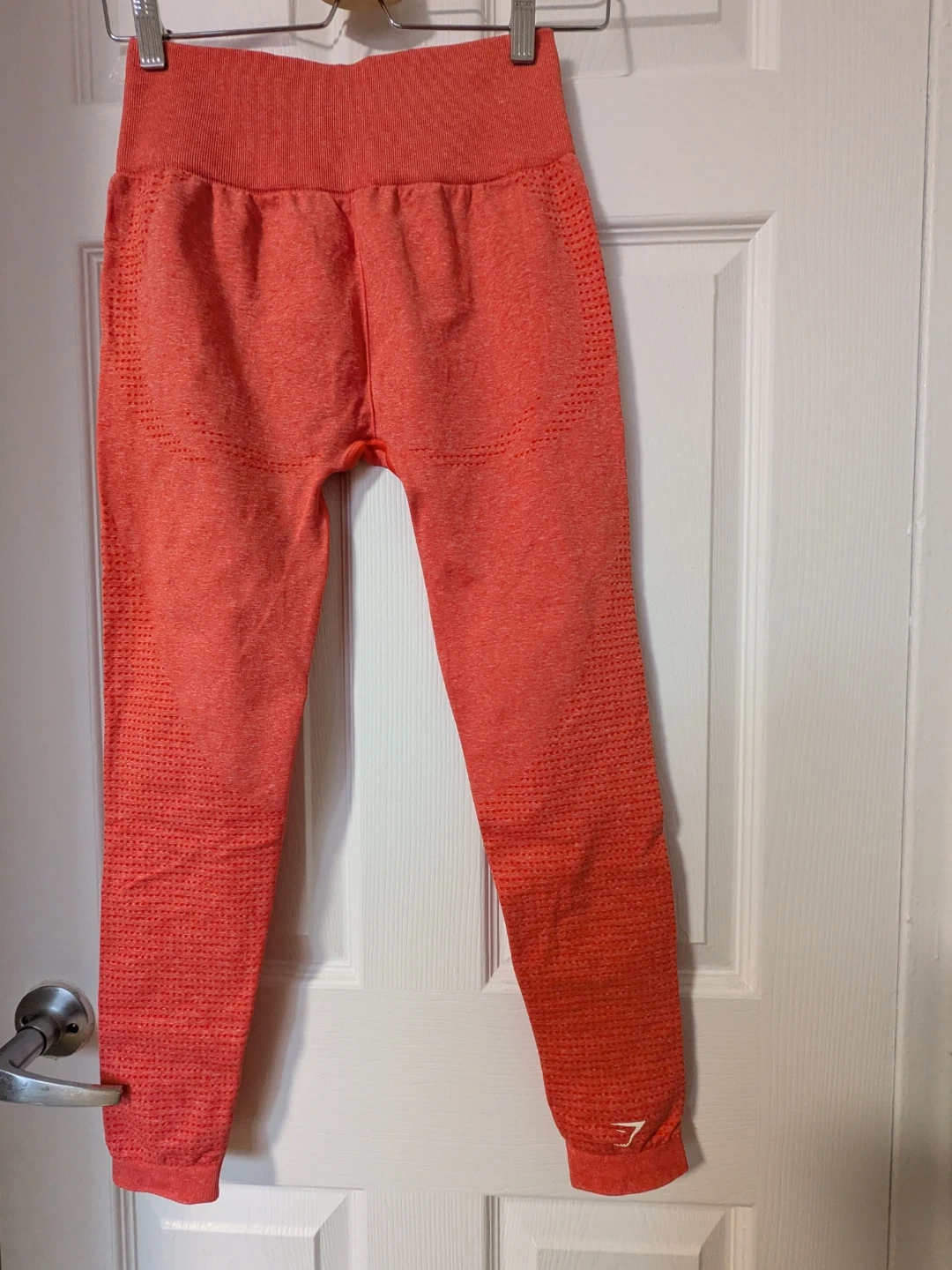 These Gymshark seamless leggings are in a vibrant coral colour. They feature a textured knit design for breathability and a flattering high waistband. They're perfect for your next workout session or for casual wear!