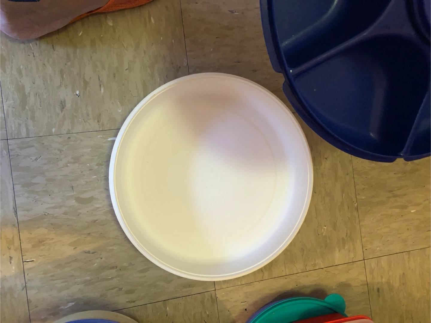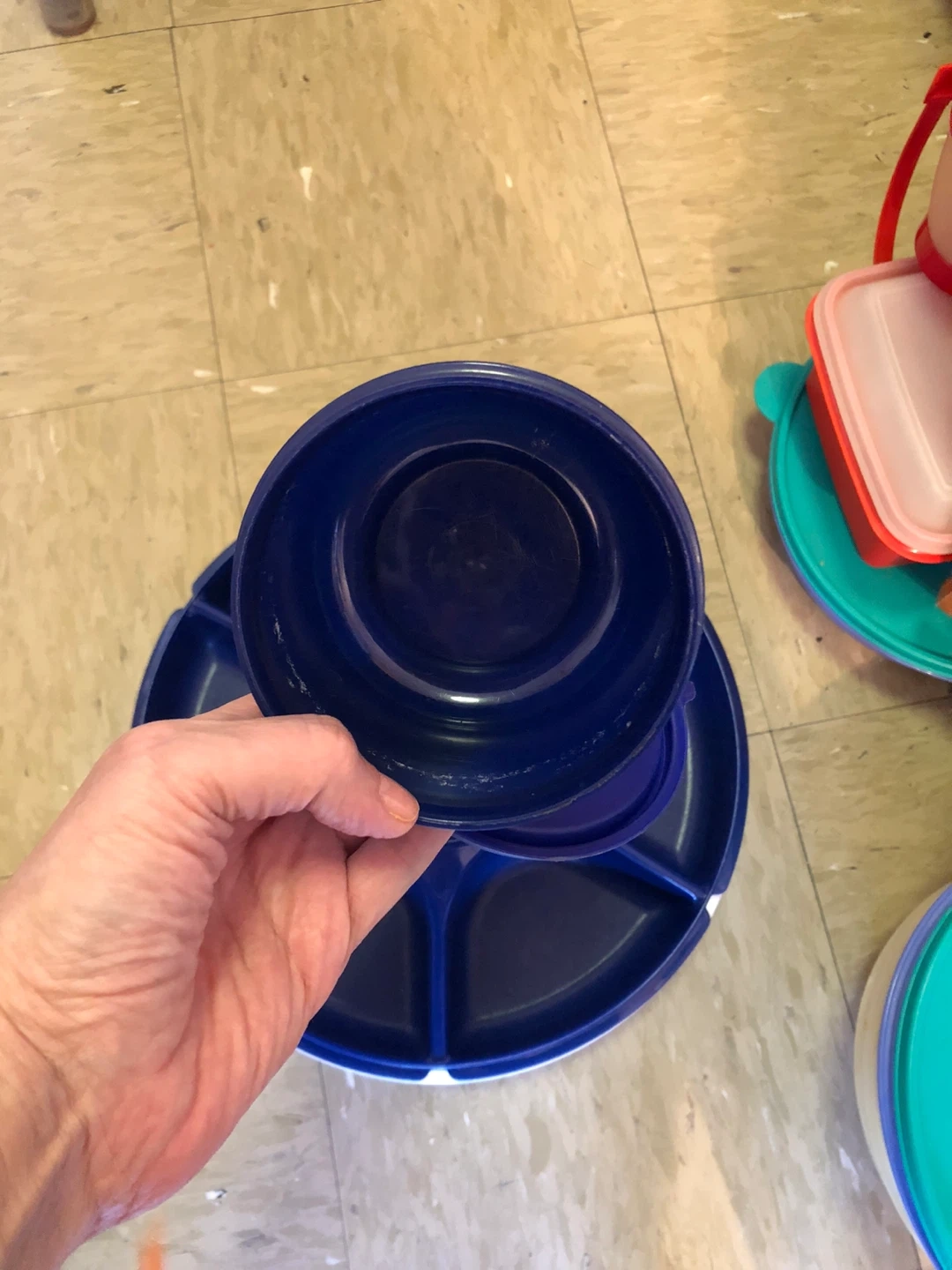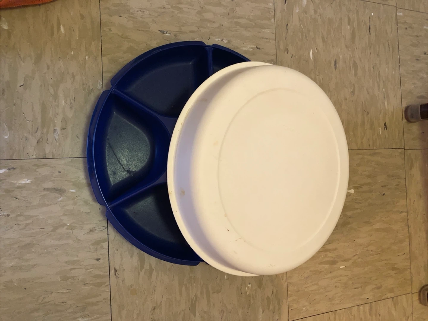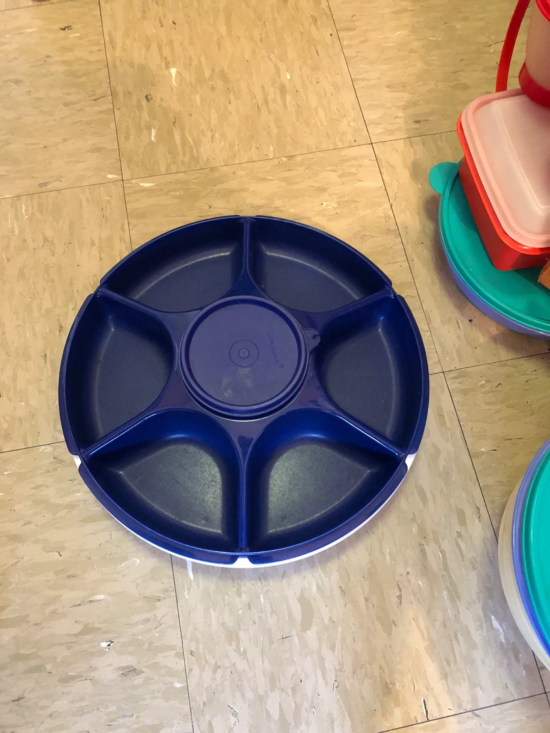 This is a vintage Tupperware divided serving platter. It's blue and white and comes with a white lid and four small blue bowls that fit inside the center. Great for serving snacks or appetizers!
