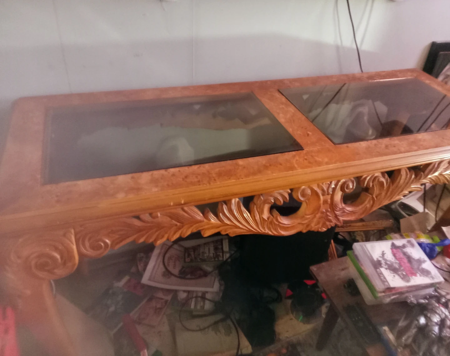 Selling an antique bird's-eye maple table with ornate wooden detailing. It features a glass top and a distinctive, eye-catching design. Perfect for adding a touch of elegance to your living room, office or entrance to your home or business.
