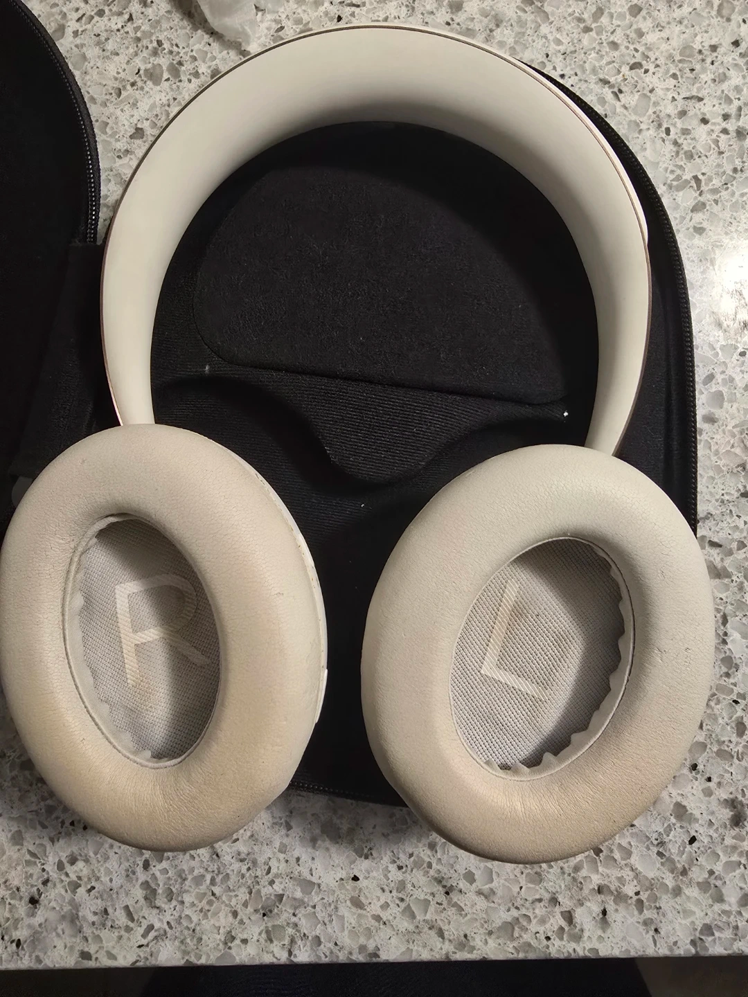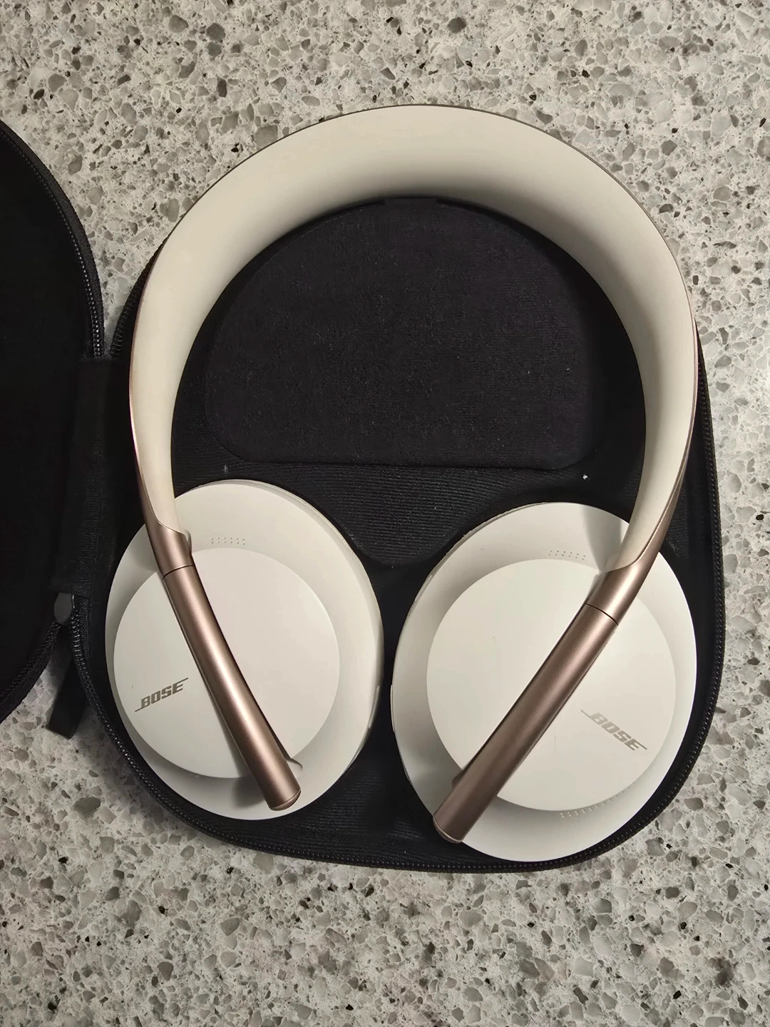 These are the Bose Noise Cancelling Headphones 700 in white with rose gold accents. They come with their original charging cable and audio cable, plus a protective carrying case. The earcups are comfortable for extended wear.