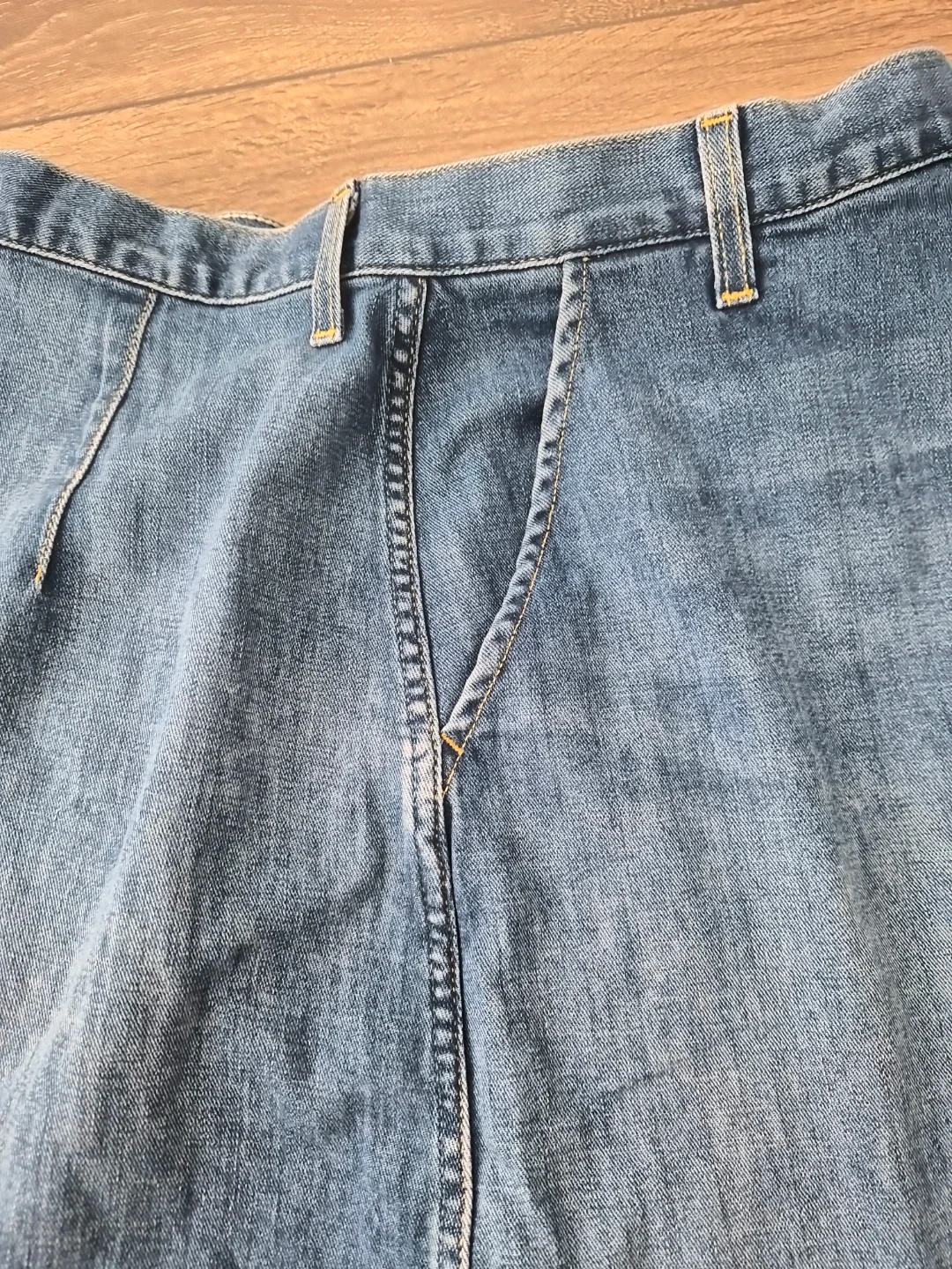 This is an AMO Marie Wrap Skirt in a 'Wistful' wash. It's made of 92% cotton, 6% EME, and 2% elastane. Made in the USA from imported fabric. NEW without tag