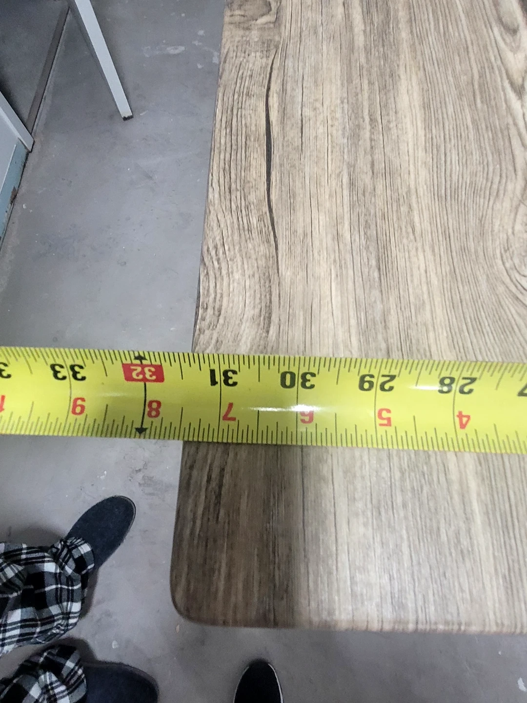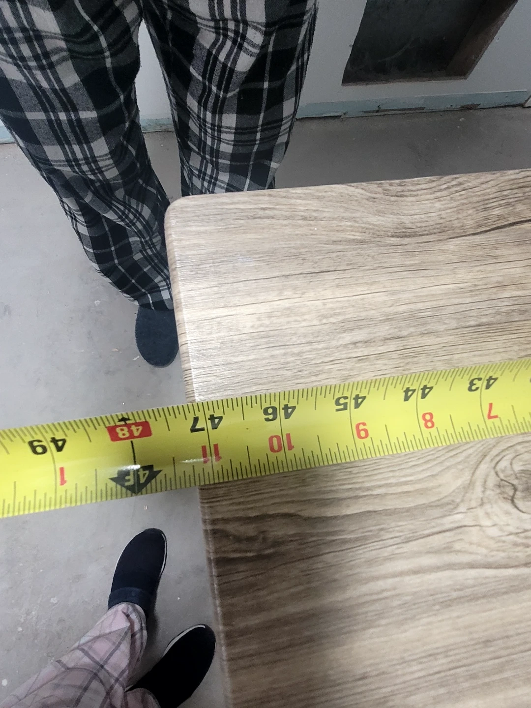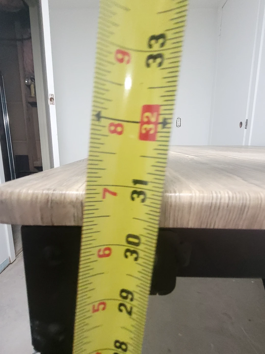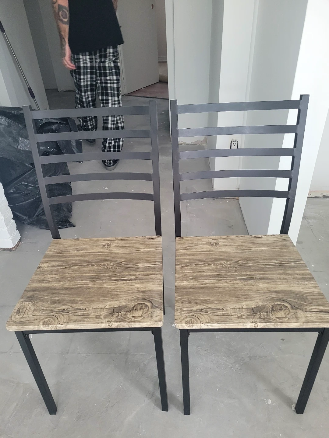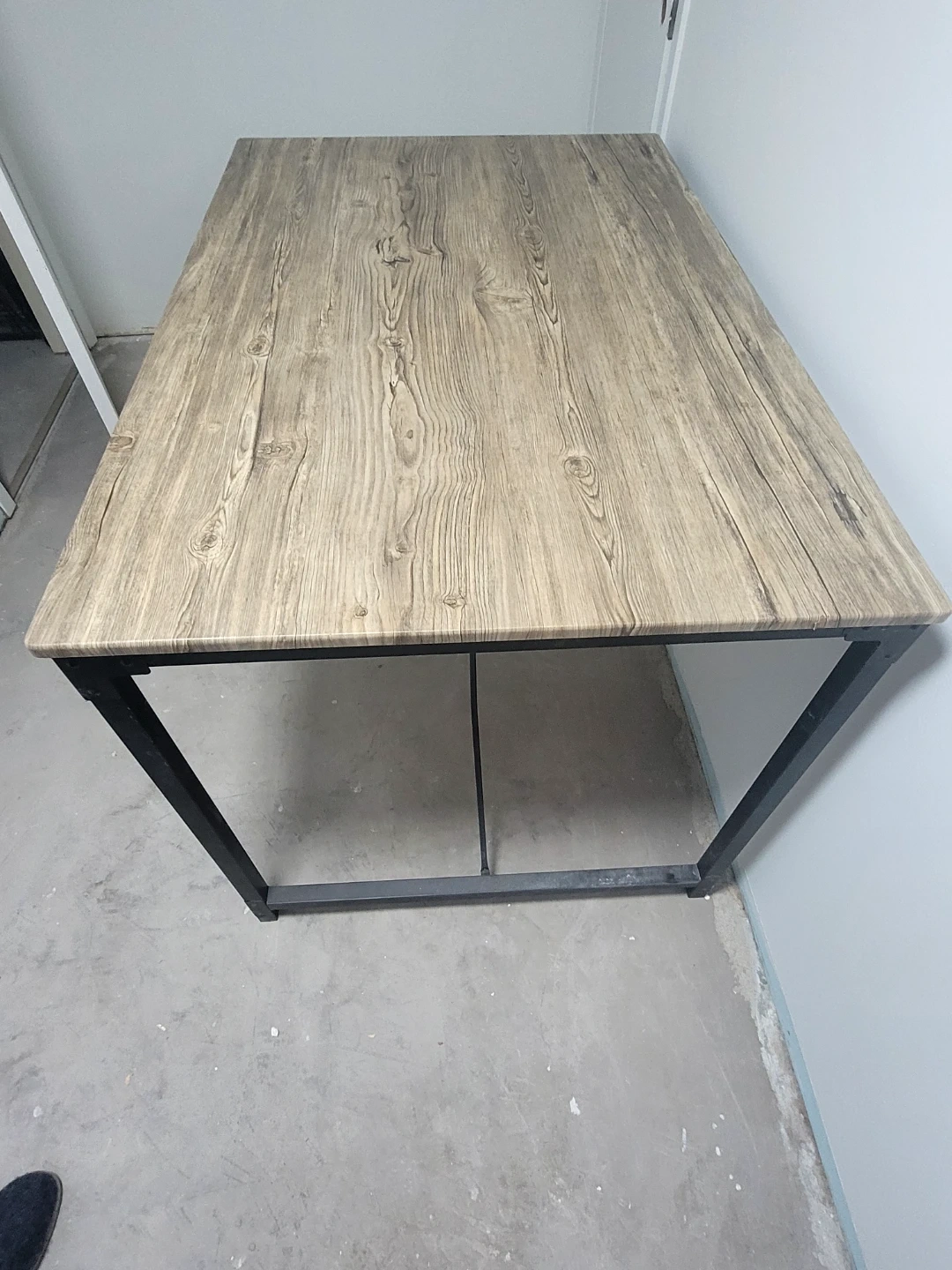 This dining table features a wood-look laminate top and a sturdy black metal frame. It's approximately 48 inches long and 31 inches high. 4 matching chairs with wood-look seats and black metal frames are also available.