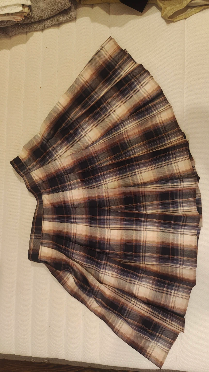 Here's a cute plaid pleated skirt! It's in great condition and ready for a new owner. The skirt features a classic plaid pattern in a mix of brown, black, and beige tones. Perfect for adding a touch of vintage flair to your wardrobe