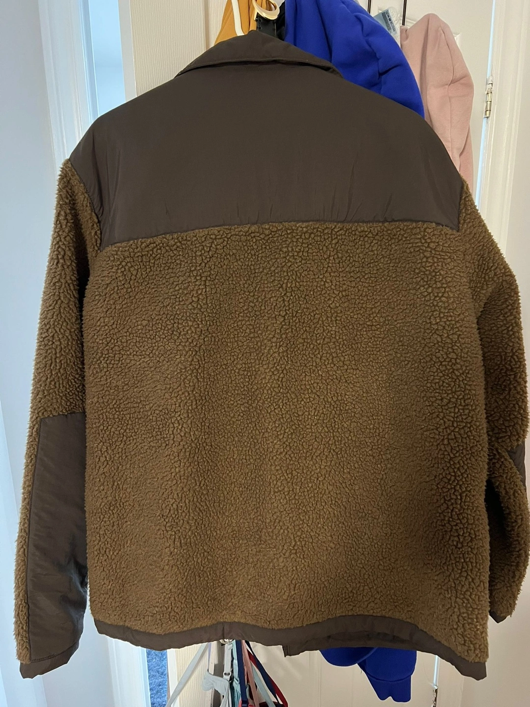 Brown fleece jacket with a black collar and zippered pockets. The jacket has a fleece lining and is in very good condition.