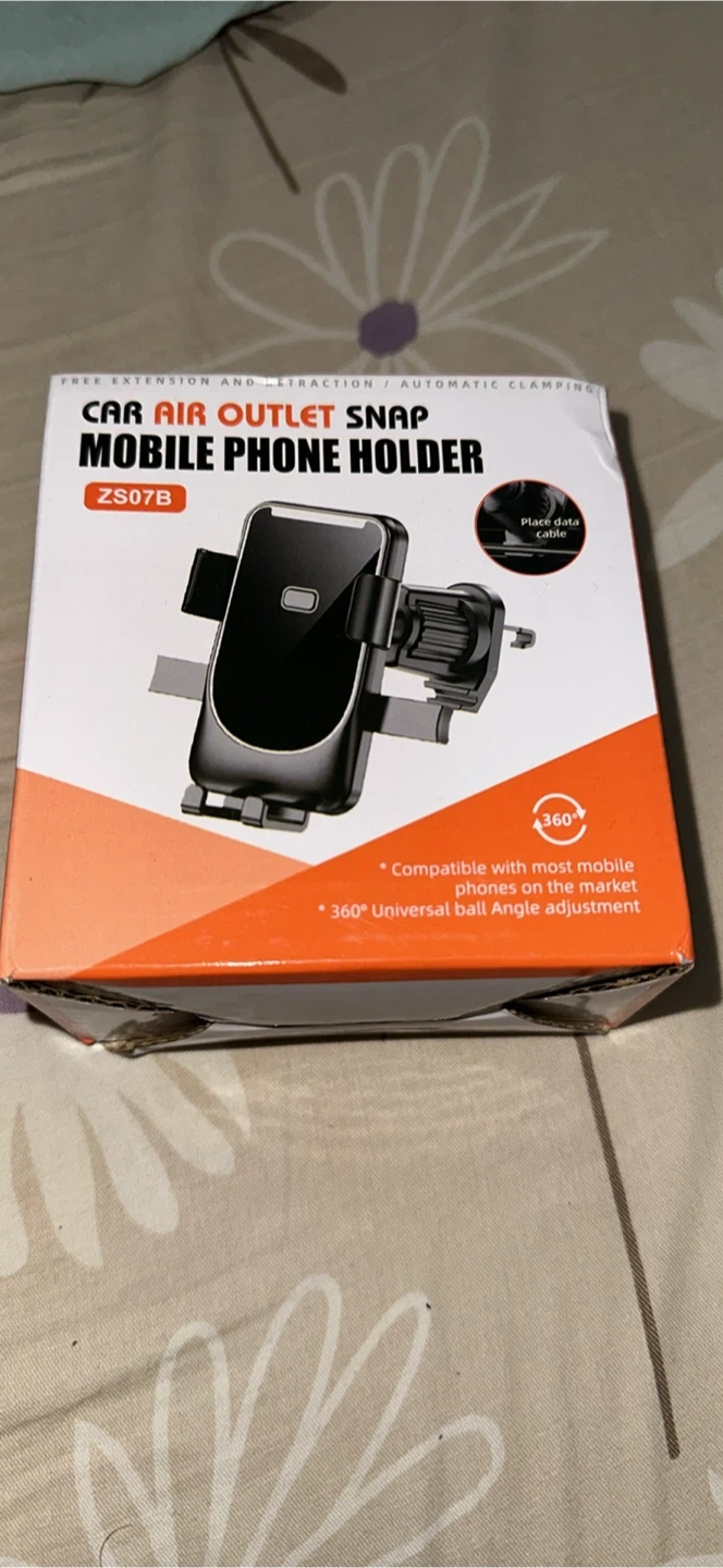 This is a car air outlet snap mobile phone holder with automatic clamping. It's compatible with most mobile phones and features a 360° universal ball angle adjustment. The holder has a model number of ZS07B.