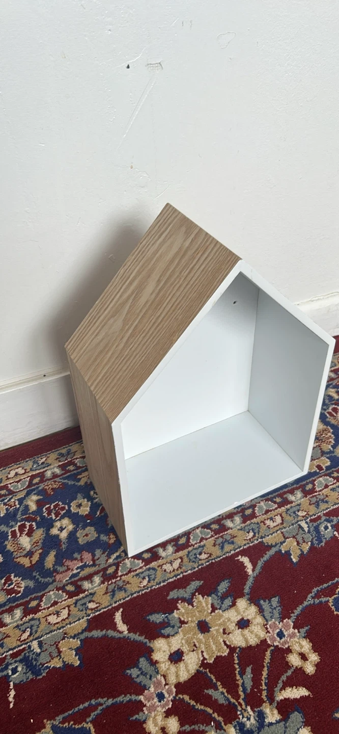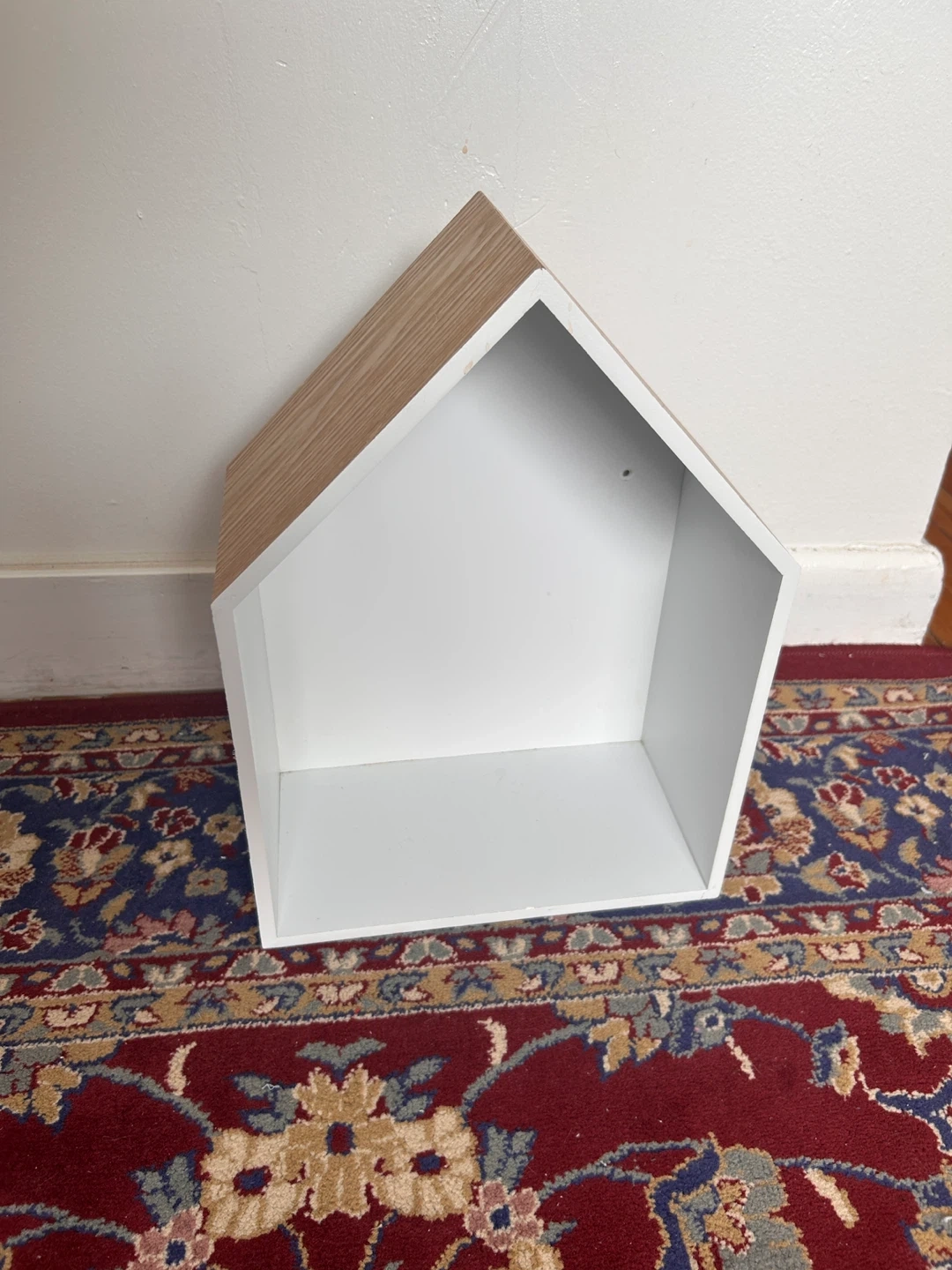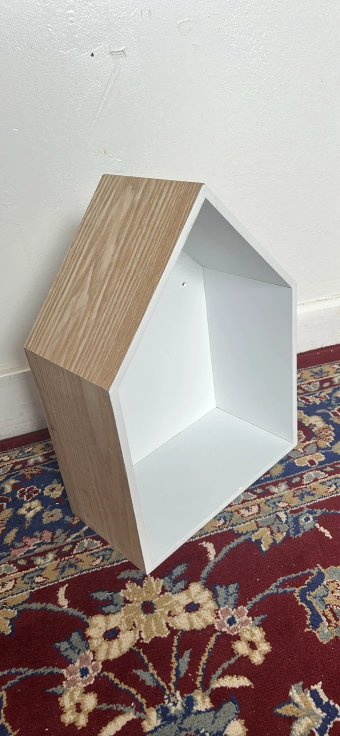 This is a cute house-shaped shelf. It has a white interior and a wood-grain exterior. Perfect for displaying small items!