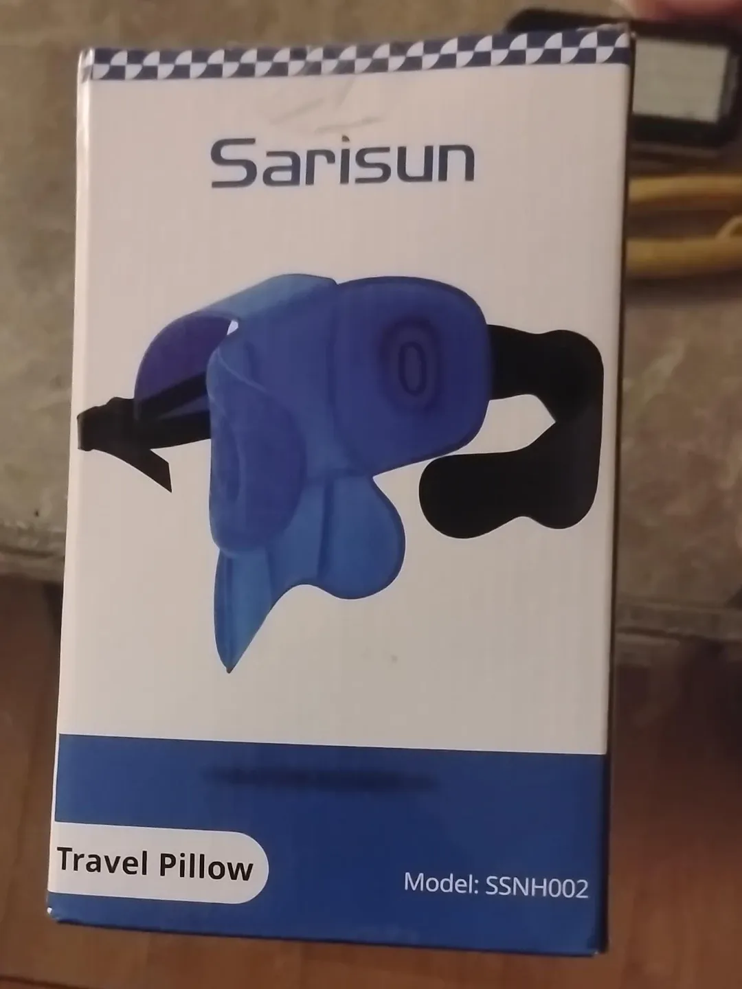 This is a Sarisun Travel Pillow, model SSNH002. It's designed for comfort during travel. The pillow is blue and comes with an eye mask for a better rest. It's useful for anyone who travels frequently.