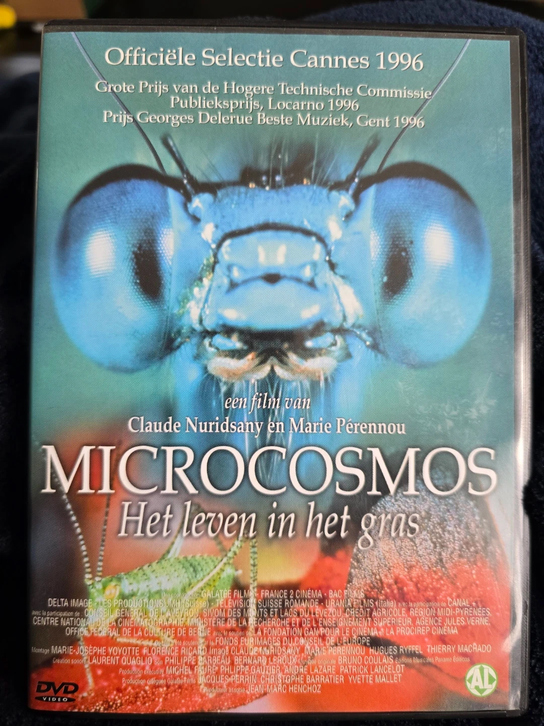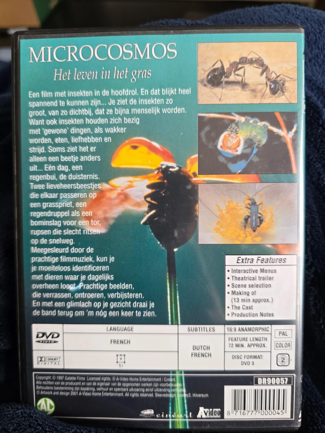 This French DVD features the documentary "Microcosmos: Het leven in het gras." It explores the world of insects with stunning close-up photography. Included are "Extra Features" like interactive menus and a theatrical trailer.